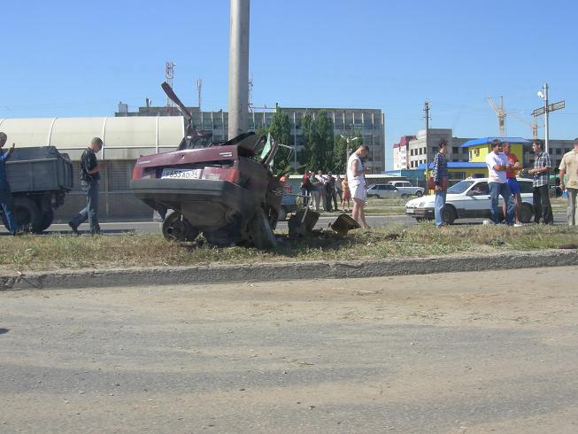 Вчера по местным новостям показывали. Водитель превысил скорость и при появлении опасной ситуации потерял управление. Шестерку об столб порвало, пассажирка погибла, водитель не пострадал, даже интервью давал.