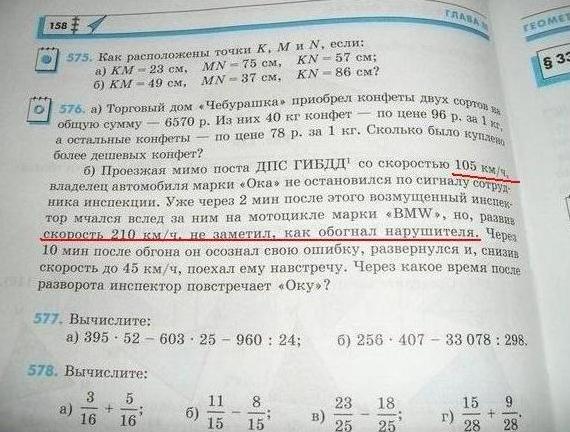 Задачи о гаишниках-тугодумах возмутили родителей В школьных учебниках по математике для 5-го класса бдительные родители обнаружили текст странной задачи, в которой в неприглядном виде выставлен служитель правопорядка. Текст странной задачи для детей 11-12 лет появился на нескольких развлекательных веб-ресурсах после того, как отец одной из учениц опубликовал в социальной сети фотографию страницы учебника, сообщает ТСН. "Проезжая мимо поста ДПС ГИБДД со скоростью 105 км/час, владелец автомобиля "Ока" не остановился по требованию сотрудника инспекции. Уже через 2 минуты после этого возмущенный инспектор мчался за ним на мотоцикле марки BMW, но, набрав скорость около 210 км/час, не заметил, как обогнал нарушителя", - говорится в учебнике. В условиях задачи говорится, что полицейский обогнал нарушителя, но осознал это только через 10 минут, то есть проехав порядка 35 км. Поняв свою ошибку, сотрудник ДПС развернулся, и, снизив скорость до 15 км/час, поехал навстречу лихому водителю. "Через какое время после разворота инспектор встретит "Оку"?", - задают вопрос авторы учебника.