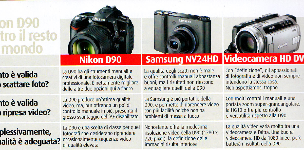 Наверное, это не очень смешно, а скорее грустно, но больше приткнуть некуда... Пошла я сегодня подумать о смысле жизни в маленькой комнатке, подсоскучившись, открыла наудачу один из старых журналов "Digital camera" (да, мы их именно в сортире храним) и обнаружила в нём статейку с названием "D90 против всего мира". Розовые сопли, размазанные по всему развороту журнала, были разбавлены вот такой вот сравнительной табличкой по поводу сабжа с "другими камерами":