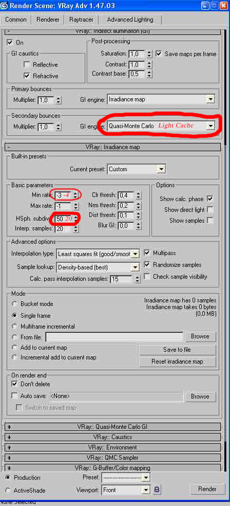 Попробуй такие настройки, советую на вторичке использовать LightCache быстрее гораздо будет считать , в настройках LightCache параметр Subdivs для тестов можно убавить до 200 а на финале можно 1000 оставить. Так же для тестов можно пользоваться настройками Irrmap такими min rate: -5 max rate: -2 потом на финале можно задрать. Еще попробуй убрать DOF на камере, проверь разницу во времени.