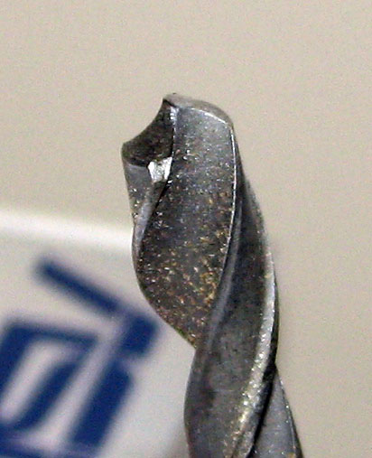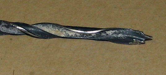 И последнее - сверло по металлу диаметром 10 мм. Про него я уже рассказывал - в теме "Не могу просверлить отверстие в металлической полосе..." На фото - снова (извините) конец сверла после того, как оно не осилило даже одного ответрстия. Отечественное сверло марки Р6М5 (кажется) пережило более 20 отверстий и издалека сразу и не определишь - какое из двух одновременно купленных свёрел новое, а какое - то самое...