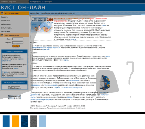 Скажу насчет колористики - здесь всё правильно - прошу на www.colormatch.dk Дальше. Выпячивание сетки как идеи - тоже стиль. (Я сейчас для одного волгоградского проекта делаю нечто в таком стиле). Композиция хороша. Хотя здесь было лениво с линейкой лазить, но на глаз - хорошо. Другое дело, что когда я это увидил, я сразу понял - "Компьютерра он-лайн" полуторагодовой давности. У них в шапке даже шрифт был похож. Вывод: плагиат в малых дозах уместен для употребления волгоградскими веб-мастерами.