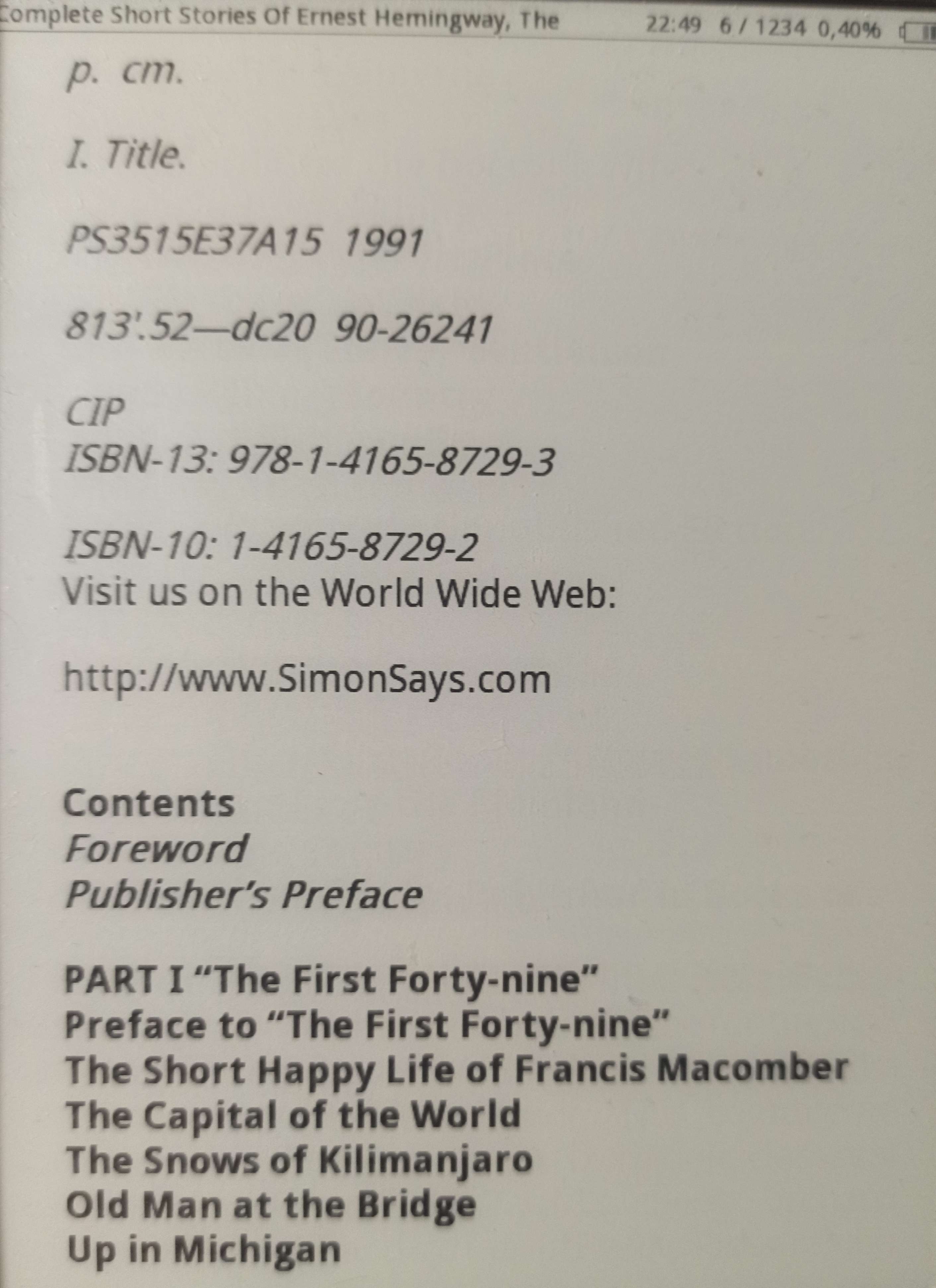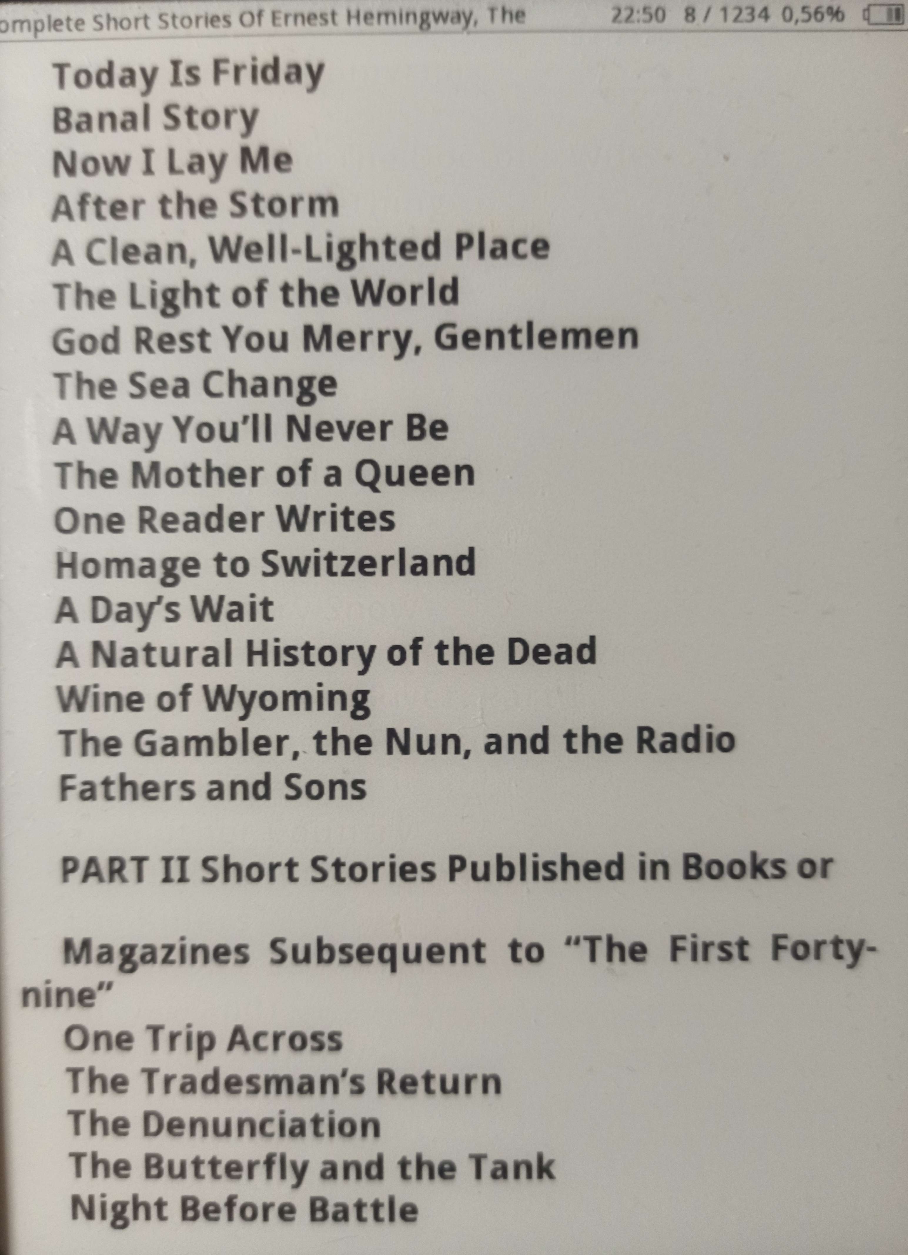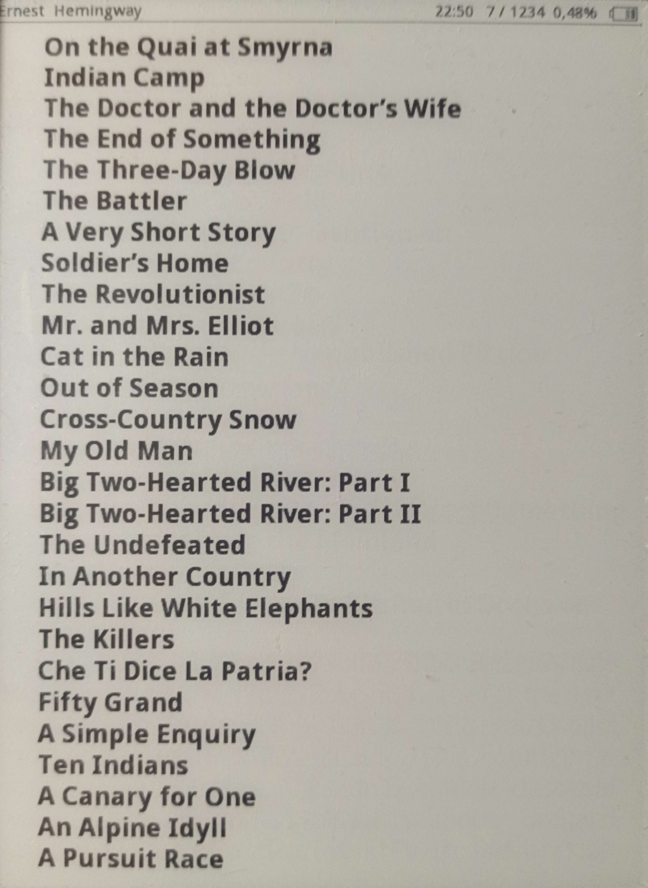 Я ж вижу, что я читаю, ну! Сборник рассказов. Коротких. Некоторые выглядят, как наброски. И я знаю, как называются ключевые произведения Хэма, просто люблю начинать щупать писателей с рассказов. Вот даже не поленюсь: