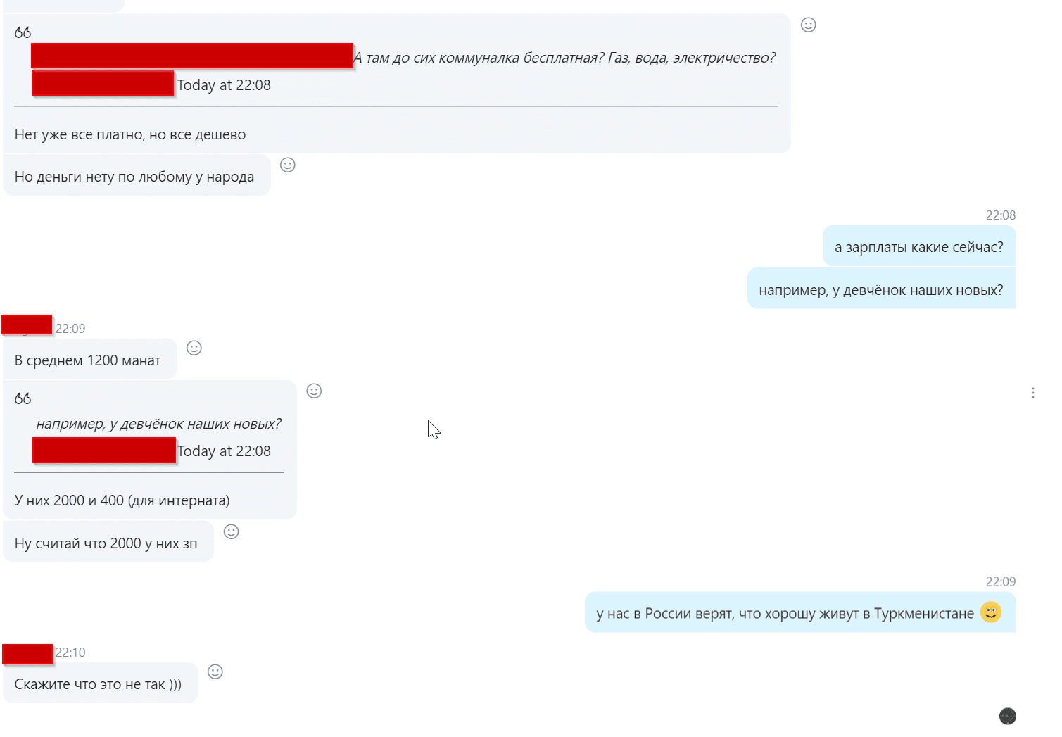 В чём удобство, если у них нет конвертации валюты? Ну или, как правильно сказал @akrivcov переводи и зарплаты в рубли по официальному курсу. Специально для тебя и @lange сейчас спросил у туркмена-бизнесмена: 2000 манат - это 100 долларов по реальному курсу. Это с рабочей неделей в 6 дней и с сменами в любое время, включая ночь. График непостоянный. Требования к ним тоже определённые были. Правда, из дома работа. Мои подчинённые они официально А средняя вон 1200 там. Хотелось бы прям, чтобы пожили вы там годик или два.