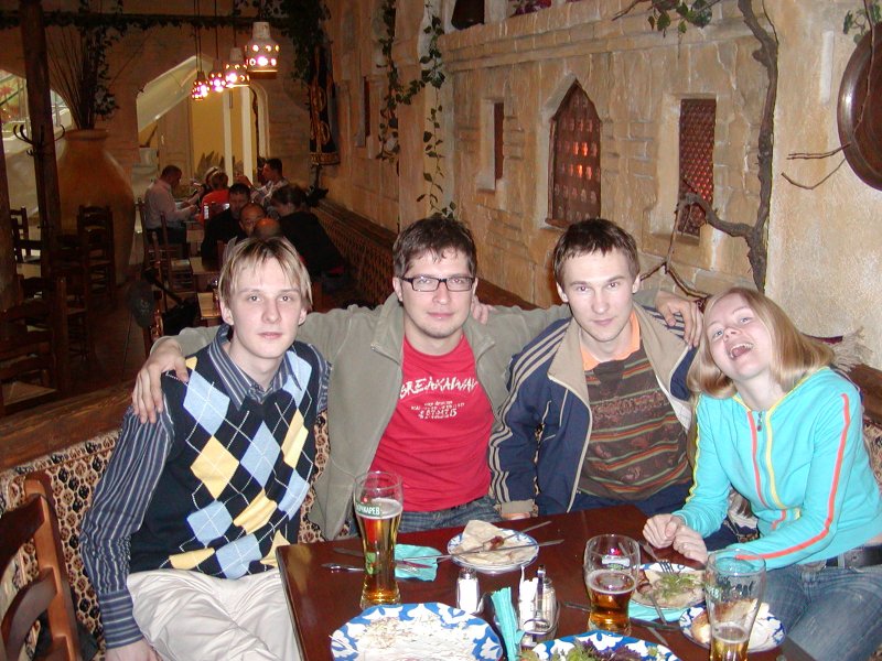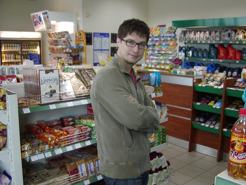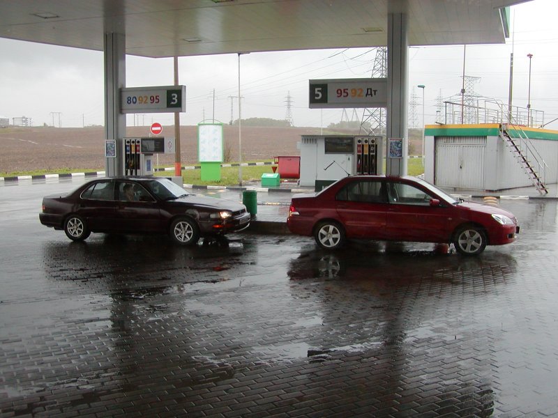 Таперь кратко. Несмотря на дождь мы как нормальные пацаны решили держать слово и доказать свои намерения делом )) Пока ехали до ашана еще наедялись на окончание дождя. Самая задница поджидала как раз у Ашана. Так как нормальные пацаны (и Катюха) просто так не сдаются мы решили таки отведать шашлыка в Меге. Кажись дело было в Киш-Мише. 1) фодко: Слим, Велкам, Катя, Пашок 2) Я, Слим, Велкам, Катя Так как я спал всяго-ничаго, видок у меня отстойный. После чего мы решили что раз бороться, так до конца, сначала переодели Велкама, который нарядился явно по дачному, в отличие от нас, модников-огородников и двинули ставить мою машину, по пути посетив заправку. 3) Вид из магазинчика заправки, Слимушкина и моя машины, вокруг - дождяра. 7) Фотка дня! )) Далее мы заехали в один боулгинг, затем во второй, затем в Колбасофф. Я на половине пути начал вырубаться, а под вечер мое больное горло не выдержало и я начал разговаривать таким осипшим голосом, что кажется, меня мало кто понимал А вообще - всяко веселее чем торчать дома