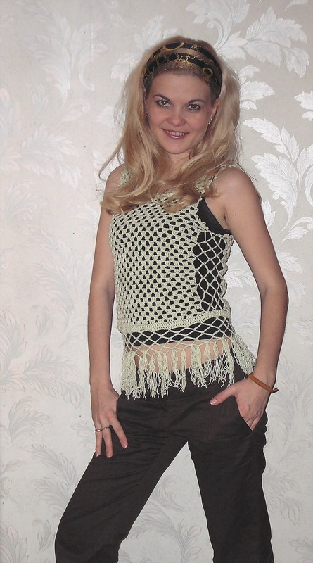 Девчонки, с долгожданной весной!!! :buket: Желаю вам весеннего настроения и вдохновения! Лично я уже полна бодрости, оптимизма и новыми идеями. На что меня вдохновило весеннее солнышко, представлю позже, а пока из старого... 1. Майка универсальная. Хороша как в сочетании с водолазкой, так и более "летним" вариантом (как на фото). Связала еще до нового года, лежала недоделанная... дошли руки. 2. Салфетка в подарок. Начинаем готовиться к 8 Марта.