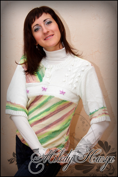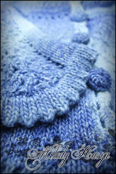 Очень понравилась нитка - мягкая и очень теплая. Если не путаю то метраж - 100м/100 гр. (возможно 200м/100 гр.), спицы №6.