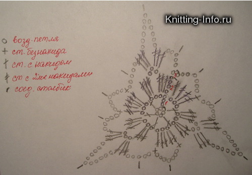 Просто Ксюша, над арочками из воздушных петель, в последнем ряду, стоят черточки - это места соединений мотивов. Если смотреть на изделие, то видны круги из мотивов. Круг образуется из 6 мотивов. Надеюсь понятно Кста, там ошибка в мотиве - в самом низу рис. не дорисована арка из в.п.