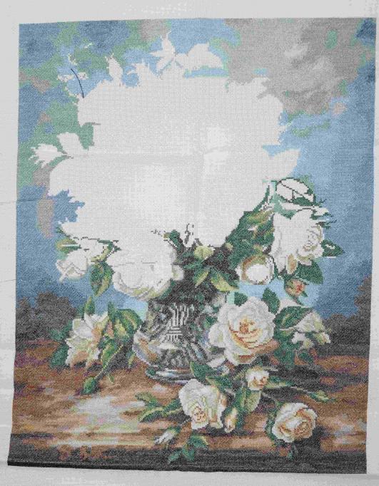 А вот работа одной моей знакомой. Искуссница она в этом деле знатная. Вышивает большие и сложные картины, побеждает с ними на выставках. Картинка немного отсвечивает из-за стекла.