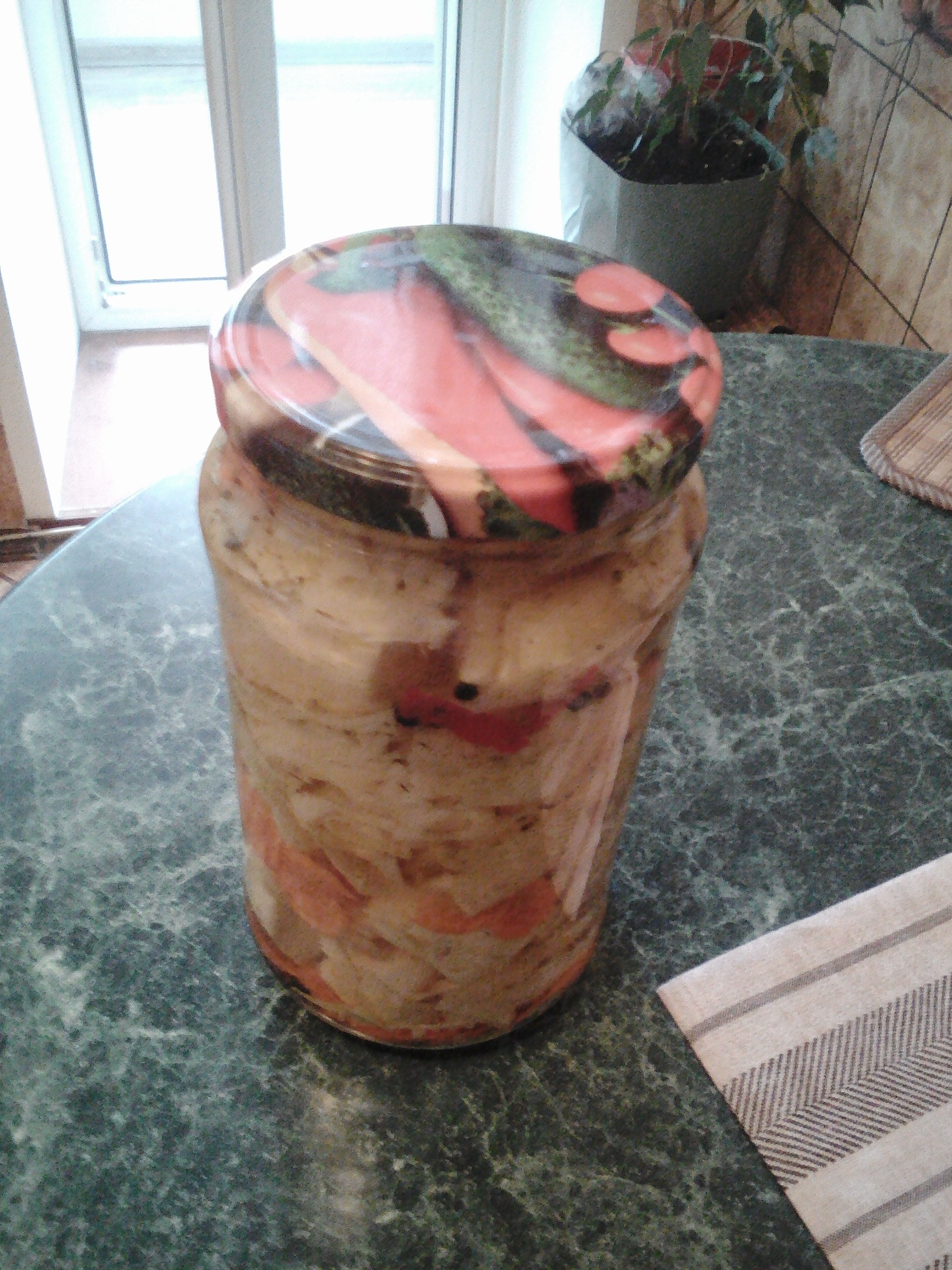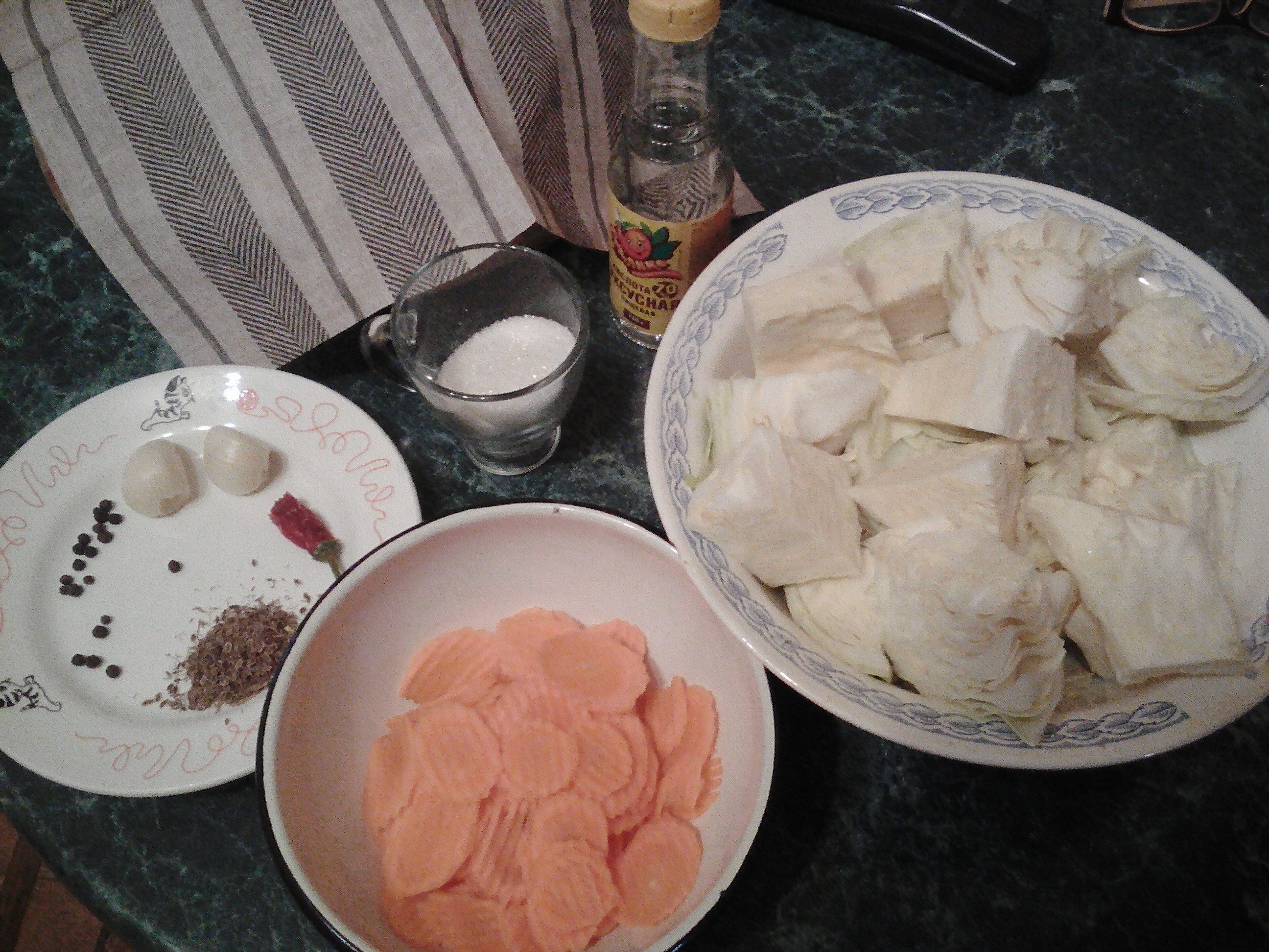 Маринованная капуста быстрого приготовления Капуста- 1кг Морковь-2шт Перец острый красный_0,5шт Чеснок-1-2 зубка Для маринада: Растительное масло- 75 мл Уксус 9%-75 мл Сахар -50 гр Соль-1 ст. л Черный перец горошком-3-4шт Вода -500 мл Лавровый лист-1 шт СПОСОБ ПРИГОТОВЛЕНИЯ 1.Капусту нарезать кусочками или соломкой. 2.Морковь натереть на крупной терке. я тру на терке рифлеными кружками 3.Перец острый нарезаем полосочками без семян. 4.добавляю сухой укроп и зелень и чеснок. 5.Укладываем плотно в банку. 6.Для приготовления маринада: Заливаем в кастрюлю все компоненты для маринада,кроме уксуса и кипятим 5 мин. Затем снимаем с огня и добавляем уксус все тщательно перемешиваем. Заливаем горячим маринадом нашу капусту,даем остыть,накрываем крышкой и ставим в холодильник на 12 часов. 7.Спустя 12 часов получается очень вкусная ,ароматная и хрустящая капуста.