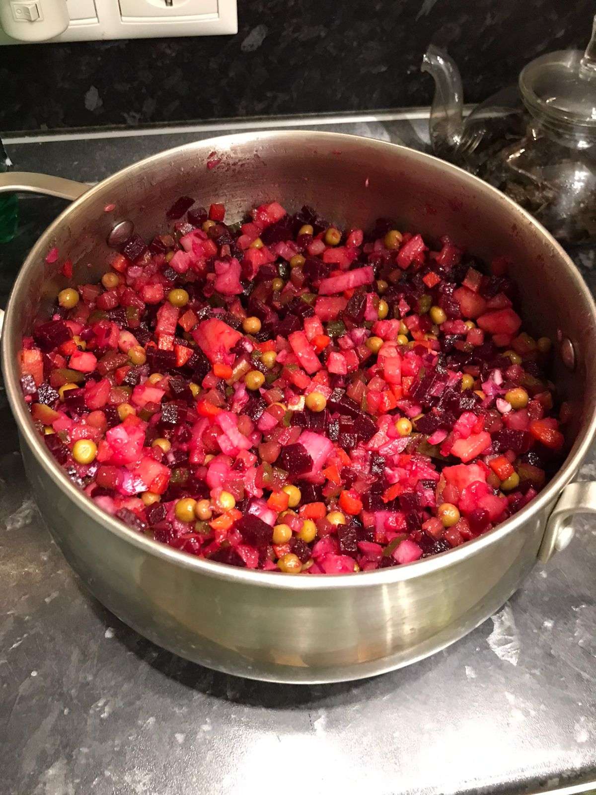 Одно время наша контора имела "дочернюю фирму", которая торговала овощами и пр... В ассортименте были вареные в автоклаве, в вакуумной упаковке: - картошка - морковь - свекла Так же продавались чищеный лук, картошка и морковь. Квашеная капуста, консервированный горошек и пр... Можно было разом заказать "набор" для винегрета. Просто порезать и перемешать. Так вот вся эта "варенка" была очень вкусной! Нравилась мне больше остальных вариантов.