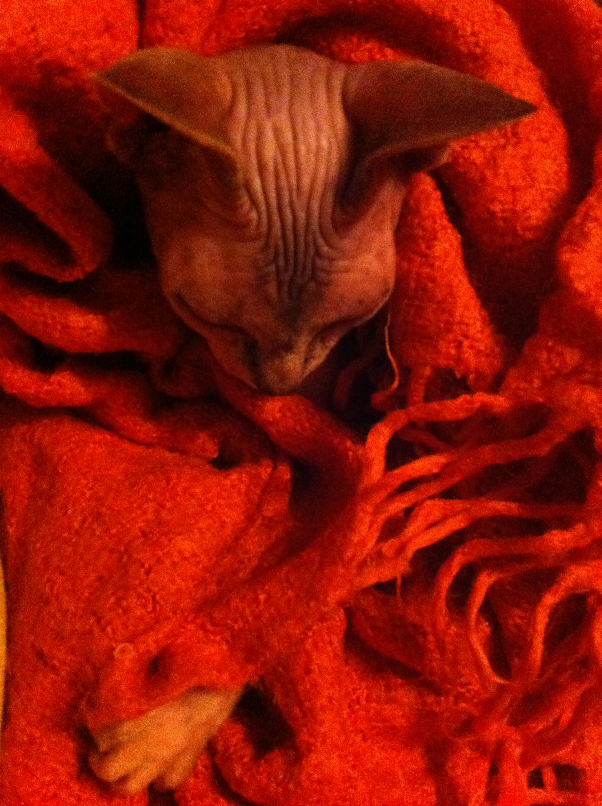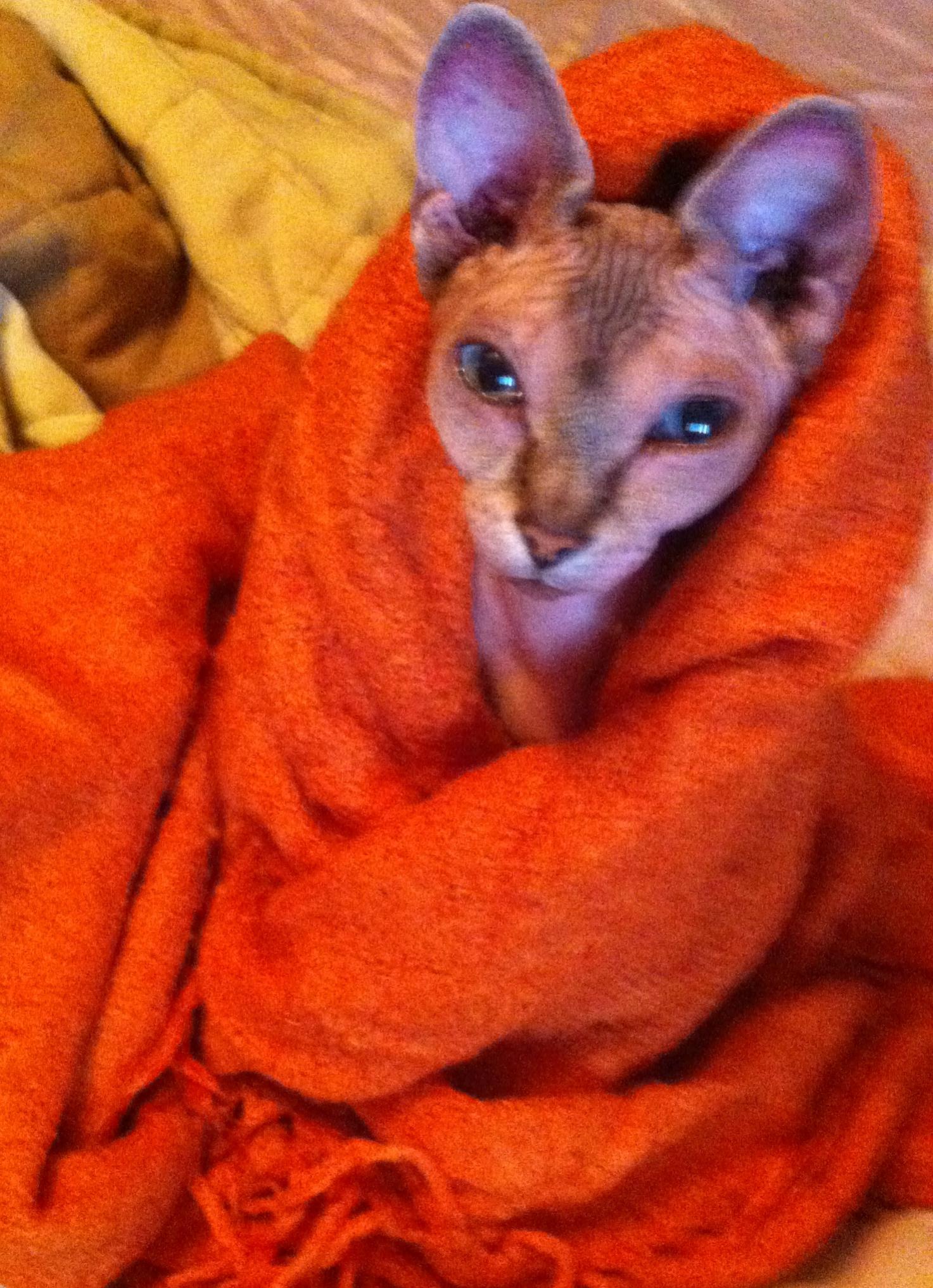 А страшненькая, да))) Крысёнок. Или обезьянка с ручками, особенно когда на задних лапках в дверь закрытую стучит))) Как Ума Турман - в одном ракурсе ну инопланетный уродец, а в другом - глаз не оторвать. Читала по сфинксам - постоянно натыкаюсь на имена соответственные, их все называют тааакими именами))) И даже жаль, что она взрослая - малявки наверно вообще трогательно-страшные и смешные.