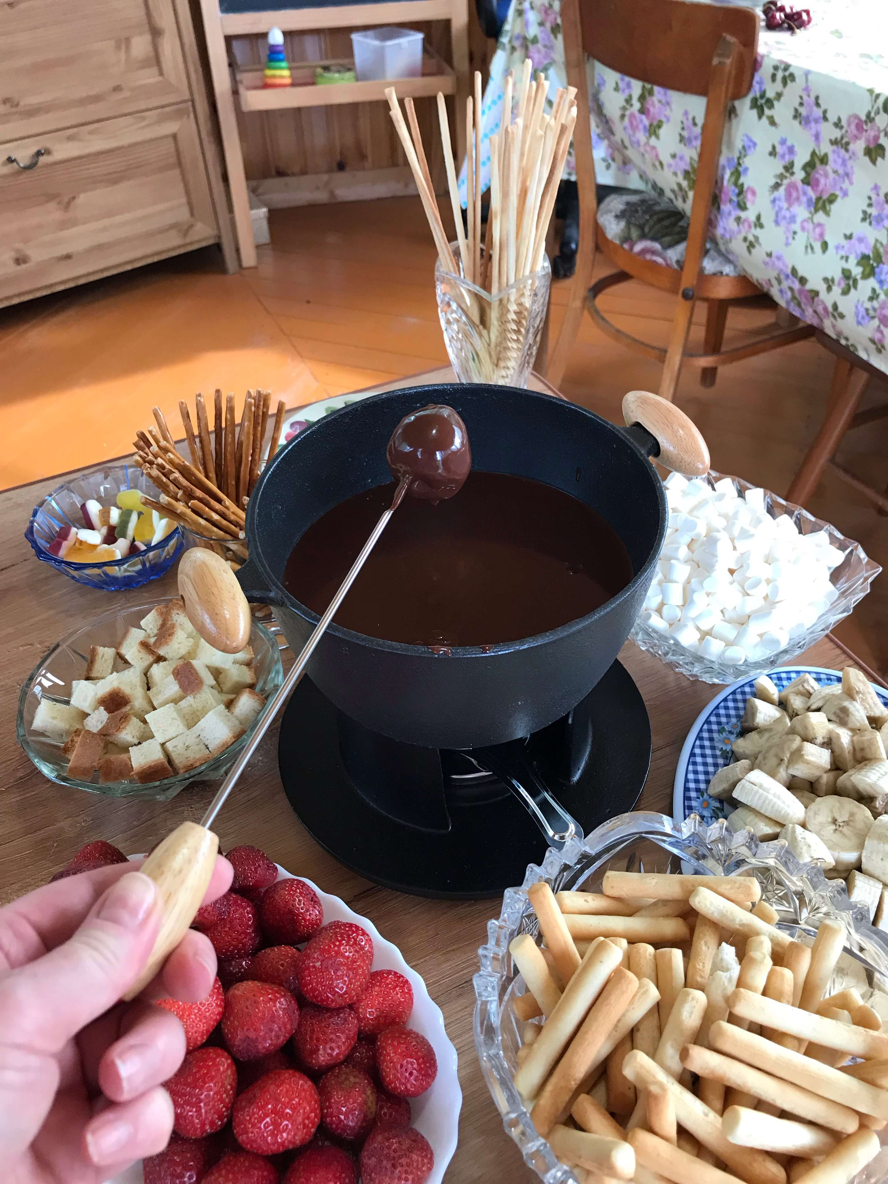 У нас более 10 лет стояла фордюшница, в прошлом году весной раскрыла) Это конечно вкусно, но обжорное обжорство шоколада)) Сырное ещё не делали, в планах. Шоколад: В кастрюлю кладем 200гр шоколада (горького или молочного, по вкусу, у меня был Ritter Sport dark chocolate 50%), добавляем 200мл сливок 10%, ставим на водяную баню, постоянно мешаем до растворения шоколада. Снимаем с бани, добавляем грамм 30 сливочного масла. Густоту растопленного шоколада можно регулировать сливками и добавлением еще кусочков шоколада. .