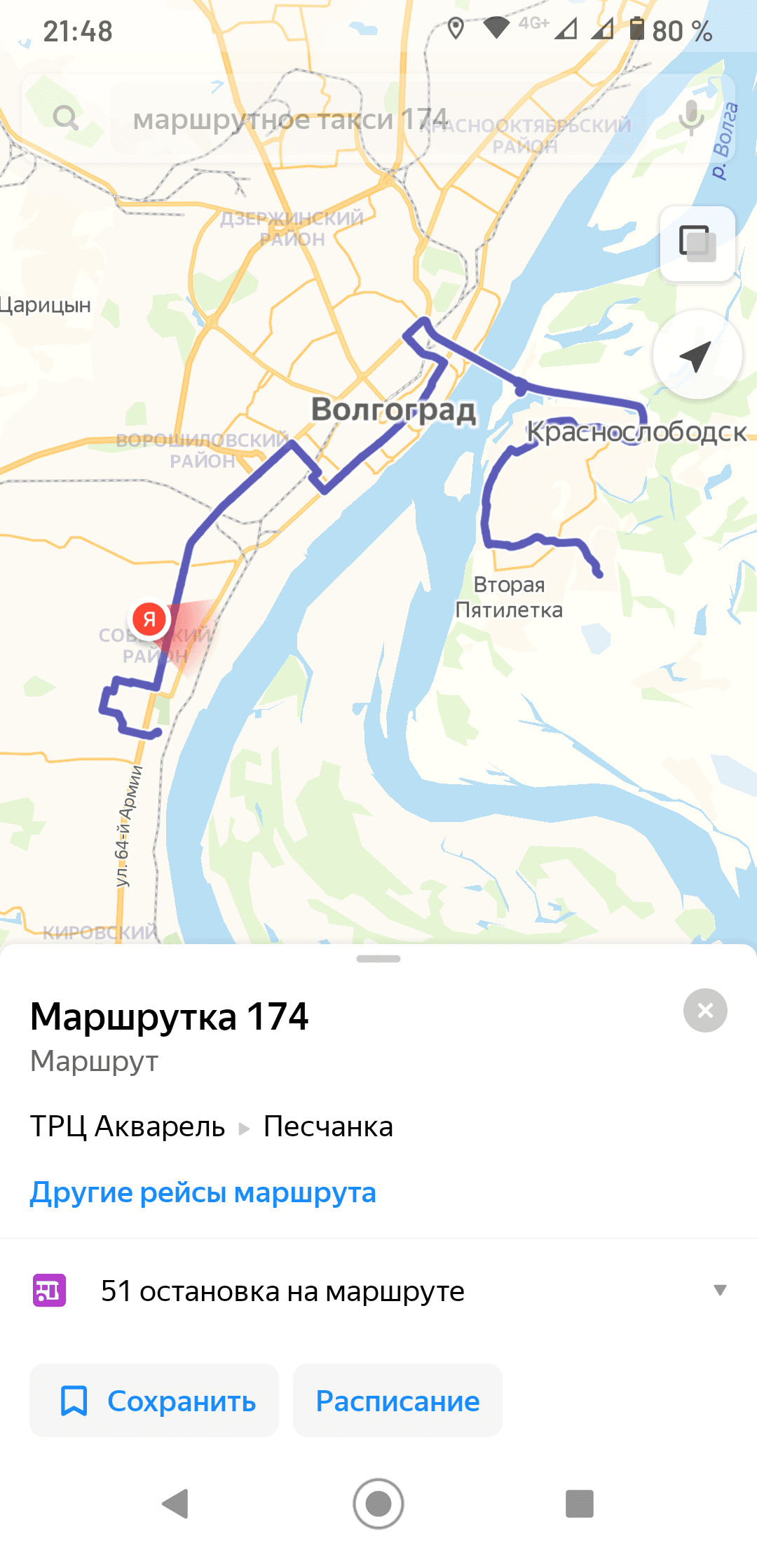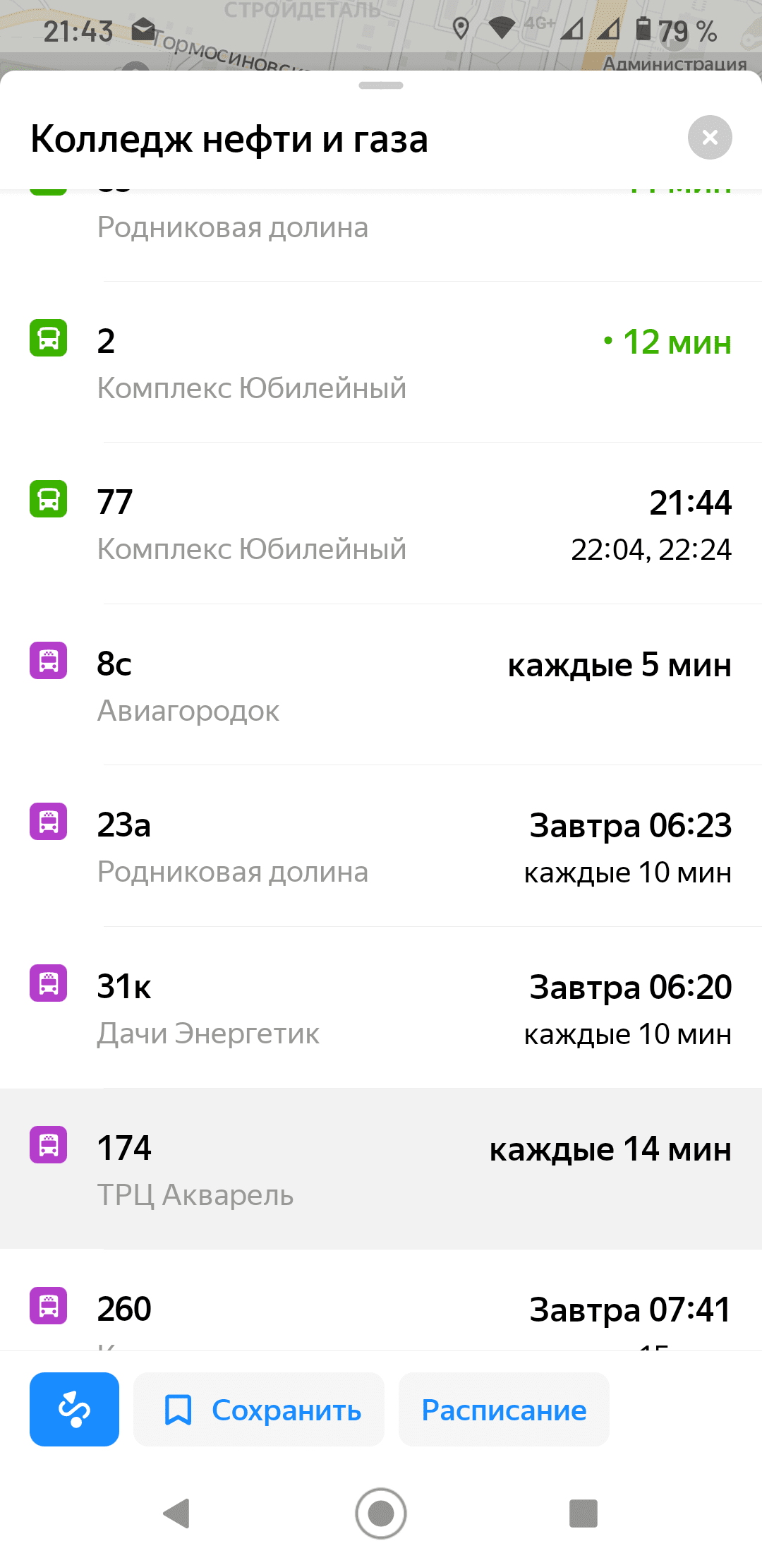 Примерно так: Забить в поиск «маршрутка 174». Именно «маршрутка», по словам «маршрутное такси №№» не находит. Искусственный «интеллект» такой искусственный... Какие-то я на карте видел, по-моему, 260. Но на нее сейчас поздно смотреть, до утра рейсов не будет.