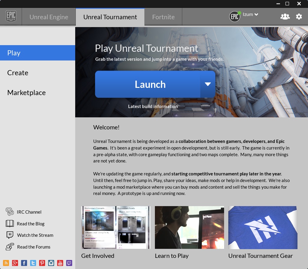 27 октября вышло очередное обновление UT4, теперь запуск осуществляется через клиент и в дальнейшем обновления будут происходить автоматически (а-ля Стим). Для игры необходимо зарегистрироваться на форуме forums.unrealtournament.com и скачать клиент https://forums.unrealtournament.com/showthread.php?12011-Unreal-Tournament-Pre-Alpha-Playable-Build Мэйл и пароль с форума используются также и для входа в клиент.