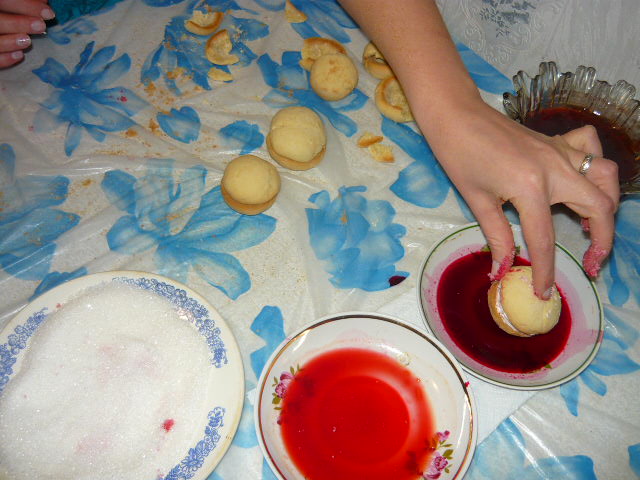 PenisEnlarger, не сплю ночами добавлено через 50 минут 1 порция (10шт). Тесто: Мука 400гр. Масло 100гр. Яйца 2шт. Сахар 100гр. Сметана 60гр.(2ст.л.) Сода Крем: Масло 200гр. Сгущенка 100гр. Крахмал В сахар добавить 1 яйцо и 1 желток, взбить. В отдельной емкости размягчить масло, добавить сметану, соду, взбить. К маслу добавить взбитый сахар с яйцами, все перемешать, взбить. Добавить муку, замесить тесто. Тесто раскатать колбаской и поделить на 20 частей, скатать шарики. Шарикам придать форму персика и выложить на противень (чуть смазанный маслом). Выпекать в теплой духовке. При готовности, верх будет белый, низ коричневый. Крем: Размягчаем масло, добавляем сгущенку, крахмал, взбиваем. Крем я убираю в холод, чтобы он немного загустел. при взбивании крема, добавляю свекольный сок, для окраски. Когда половинки персиков остынут, ножом вырезать у них углубления, аккуратно, могут ломаться. В углубление кладется крем, соединяются половинки, один бок обмакиваем в свекольный сок, другой в морковный, обваливаем всё пирожное в сахаре и на блюдо. Я их на некоторое время убираю в холодильник, чтобы застыл крем. Для сока овощи тру на мелкой терке и отжимаю через марлю, хватает небольшой моркови и свеклы. Когда есть орехи, кладу в серединку, типо косточка)) На фото у меня три порции)))