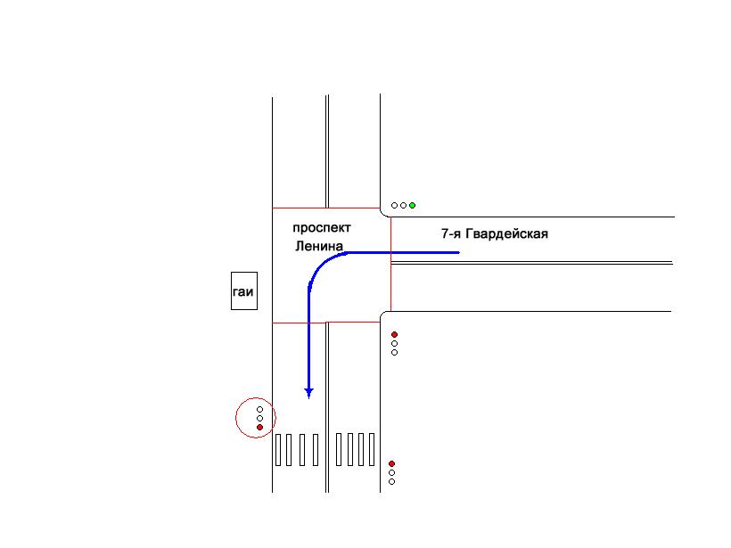 ой, боюсь, боюсь, боюсь, :freddy: :freddy: у нас на каждый электрощит... знаете-ли Вай, слющай, эта он Лэзгинку танцует, панымаешь, да !!!!!!!!!!!!!! Короче так: перекресток седьмой гвардейской и проспекта Ленина является Т- образным перекрестком, сколько бы ни было там наставлено светофоров на подъезде к нему по проспекту Ленина. Выезд с перекрестка при движении с Седьмой гвардейской на пропект Ленина налево - это как раз автомобильный светофор висящий над пешеходным переходом, о проезде которого и возник спор. Следовательно, этот светофор можно проезжать, при повороте Седьмой гвардейской на пропект Ленина налево, независимо от сигнала светофора, предварительно пропустив пешеходов, переходящих на зеленый.