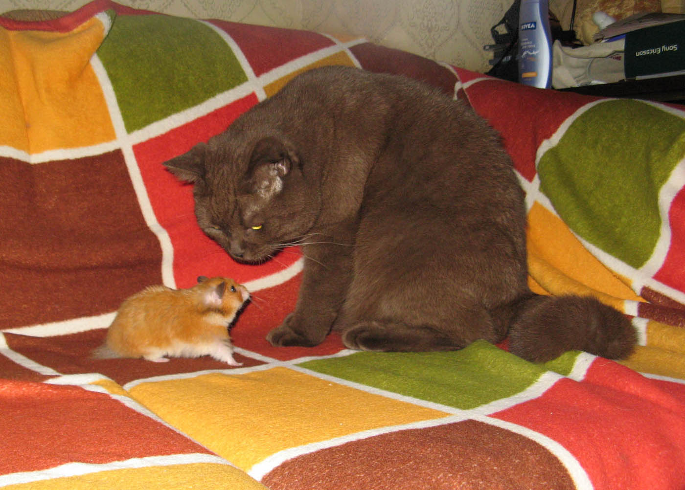У моего Петрония новый сосед - хомяк Мишка. Мишка попал к нам случайно - его хозяева уехали в Москву и хомку девать было некуда. Поэтому теперь живности привыкают друг к другу. Сразу скажу - хомкиной жизни кот не угрожает. Он его боится и предпочитает делать вид ,что хомяка просто не существует. Но знакомство все же произошло - две мордашки столкнулись на диване.