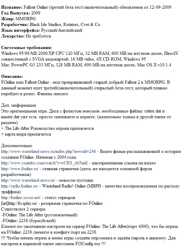 Открыт первый публичный тест! Q: FOnline? Что это? A: FOnline (сокрщение от Fallout Online) это мод для Fallout2, который позволяет играть по сети множеству игрокам одновременно. В связи с тем что родной движок фаллаута не предоставляет этой возможности, то для этого создаются новые клиент+сервер.