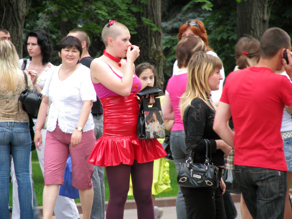 Тоже неоднократно наблюдала этого товарища в районе Горсада и Гасителя. Лет пять назад, наверное, впервые его увидела. C подругой он замечен мною впервые года два назад. Но у нас в городе есть еще одна загадка - женщина «Дюймовочка-Травести» размера не менее 56 и роста под метр восемьдесят..." Одевается крайне ярко (предпочитает цвета типа цикламен) и водит пуделька на красном поводке. Подозреваю – имеет отношение к цирку. Приковывает к себе все взгляды… Ареал обитания – предположительно Ворошиловский район.