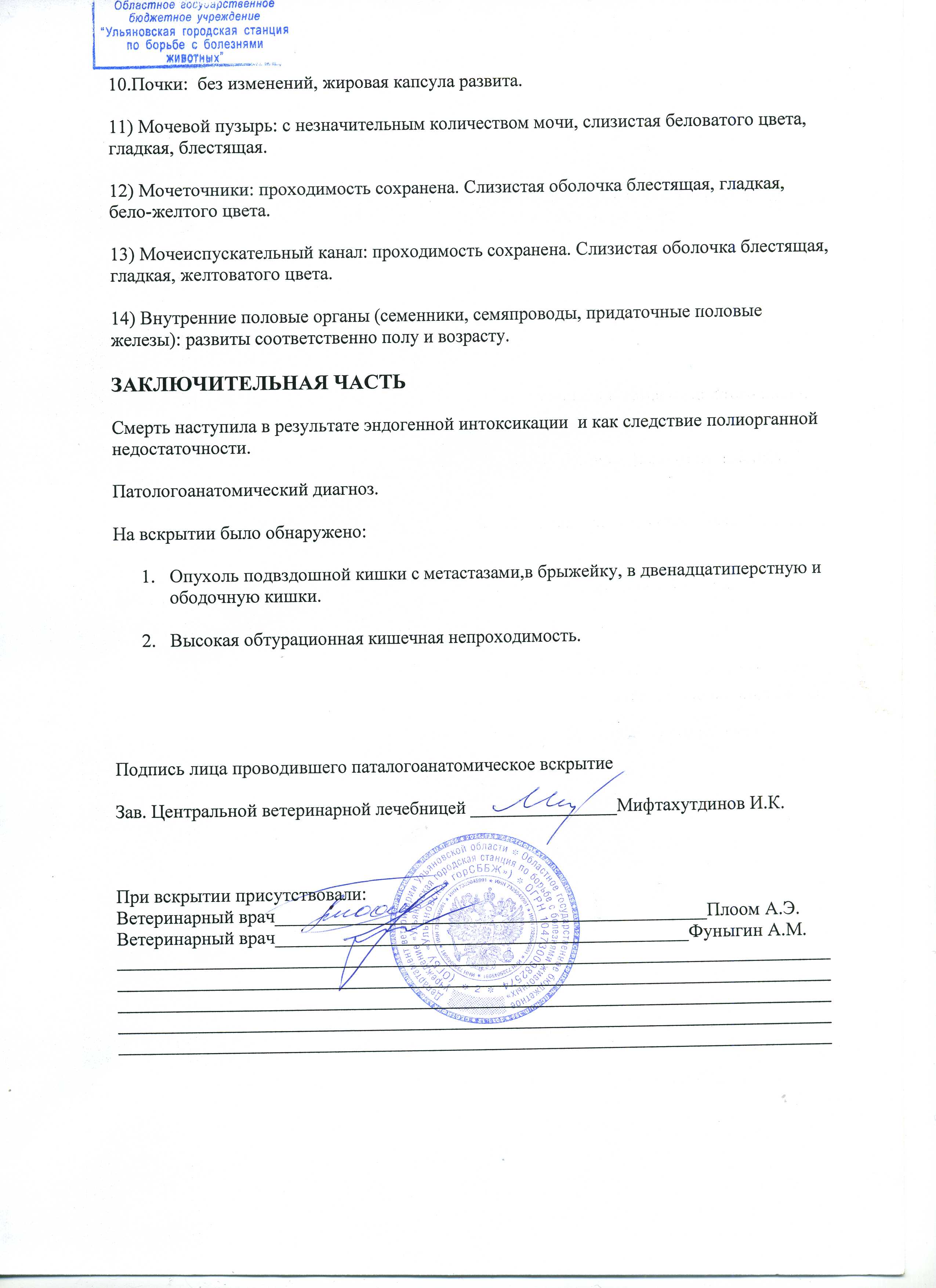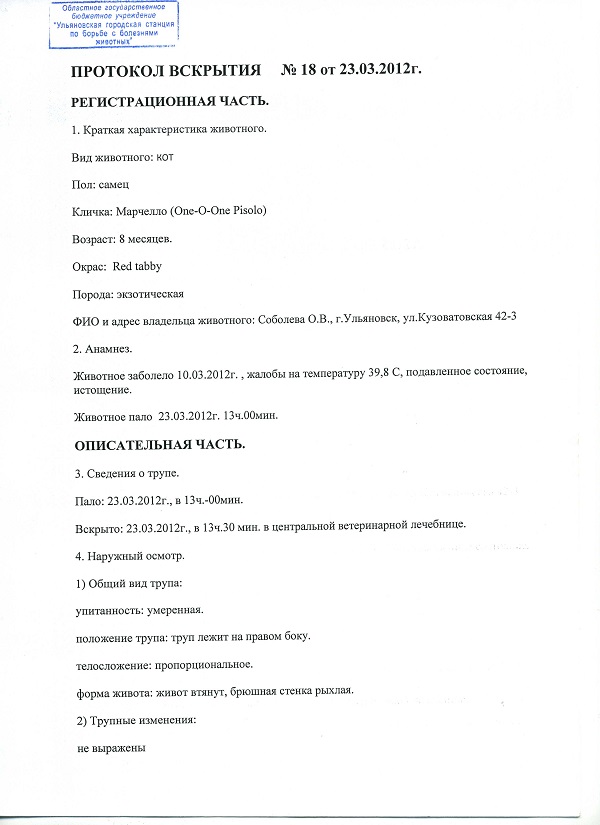 вот,в моем понимании, нормальное подробное описание вскрытия,которое позволяет оценить достоверность заключения,например: кот привозной, погиб предположительно от онкологии через 3 месяца после приезда в новый дом.