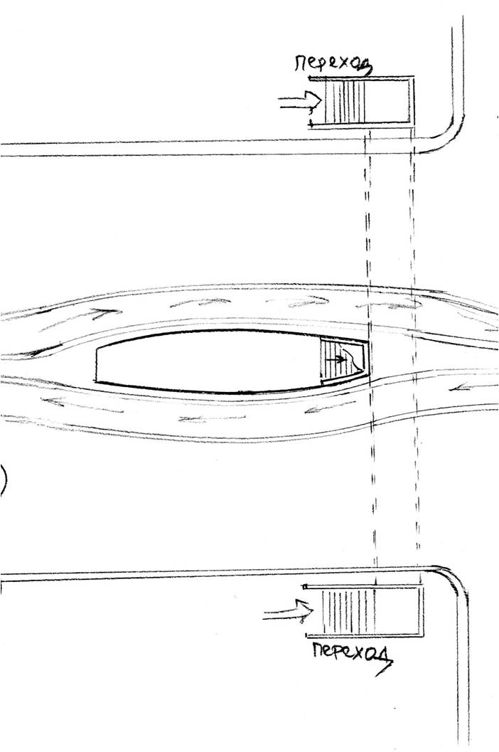 Ну вот, наспех нарисовал, можно сказать от руки, чтоб яснее было. Штриховкой обозначил коридор подземного перехода. Что касается ширины выхода из перехода, то её не обязательно делать как на «Комсомольской» Можно гораздо уже 2-2,5 метра вполне достаточно