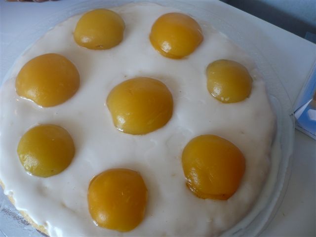 Пирог "Яичница" Тесто делаем по предыдущему рецепту, убираем в холодильник на часок. Потом раскатываем в один корж и выпекаем. Консервированые абрикосы откидываем на дуршлак и даем стечь жидкости. На остывший корж распределяем абрикосы. Делаем глазурь из 150 грамм сахарной пудры и 4 ложек лимонного сока. заливаем пирог.