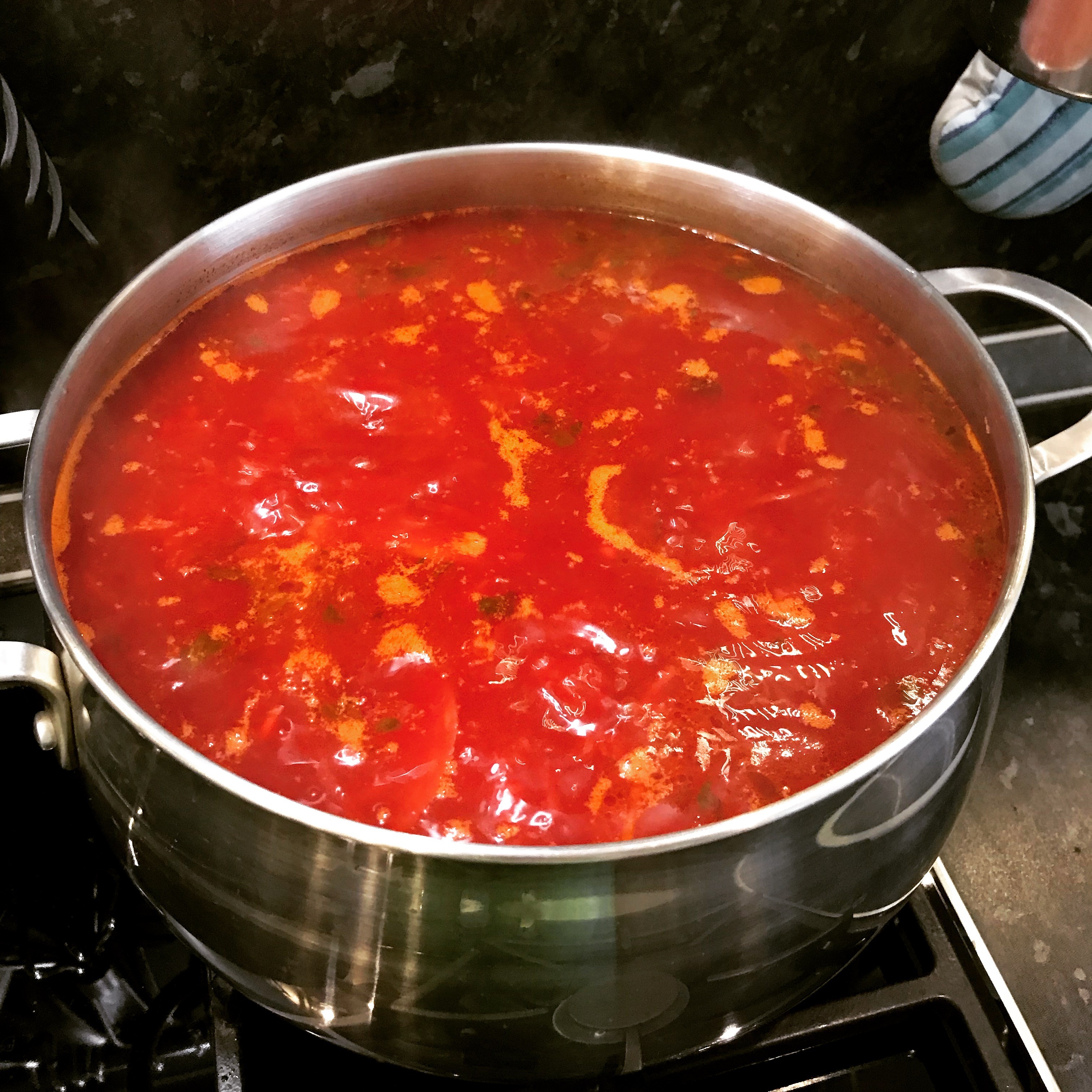Сегодня борщ ну очень быстро и подойдёт для веганов тоже)) Вчера в Глобусе купила нашинкованные овощи, что сегодня мне съэкономило кучу времени. И так, бульон: вода, морковь целая, луковица, перец горошком, лавровый лист, стебли укропа/петрушки - всё закипело, покипело, сварилось. Пока варился бульон, готовилась пережарка в большом сотейнике: оливковое масло, сразу вместе репчатый лук+морковь+перец болгарский красный, обжарила, добавила свеклу, томатную пасту (магазинную), зелень, чеснок - накрыла крышкой, тушилось. В бульон картофель, предварительно вымачиваю в воде минимум 30 минут. Через некоторое время капусту в бульон. Чуть позже фасоль красную консервированную и пережарку, всё закипело, пару минут и выключила. В тарелку сметаны, чёрный хлеб с пузаниной и горчицей))) Сметана есть, остального нет) Борщ, щи, солянку и харчо, предпочитаю варить в 5ти литровой кастрюле. Остальные супы делаю на 3л. На плите тоже без мяса получается очень даже.