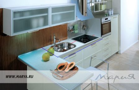 ОК. Проект посмотрела. Кухня, надеюсь, больше 10 м2? Имхо. Отмеченным синим отрезок для минимального удобства пользования должен быть не менее 270 см. + 2 шкаф по 60. Духовка с боковым открытием будет лучше.