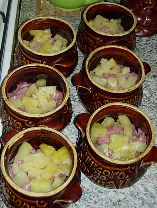 Свинина с ананасами Продукты: - свинина - банка консервированных ананасов - специи - соль - сыр - картофель - майонез Сначала маринуем свинину: Режем кубиками, складываем в емкость, специи, соль - по вкусу и заливаем ананасовм соком и оставляем на 1,5 часа (можно на ночь). Затем чистим картофель и режем соломкой, выкладываем на дно. Сверху маринованную свинину. На нее кусочки ананаса. Далее трем сыр и посыпаем им. Потом снова беремся за картофель, но теперь нарезаем его кружочками и выкладываем плотно, как бы делая "крышечку", заливаем майонезом, разливаем оставшийся маринад и отправляем в духовку примерно на час. Приятного аппетита