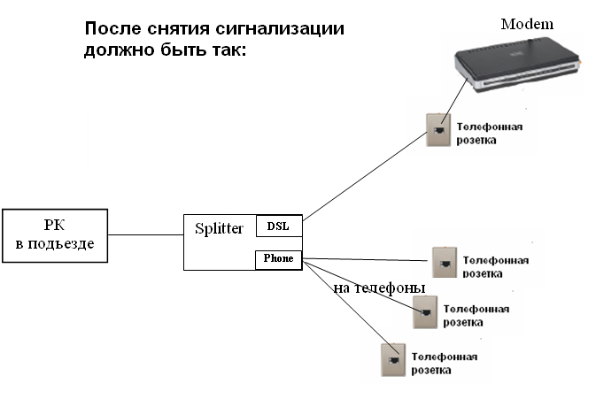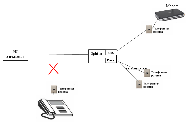 lexic, опиши подробно разводку по-квартире, желательно нарисовать в паинте, например Меня интересует: - сколько телефонов - где стоит сплиттер - откуда и как идет провод до модема и до каждого телефона. Думается, либо сплиттер не там где надо стоит, и какой-то телефон сажает линию, либо шаманство Болжно быть примерно следующее: