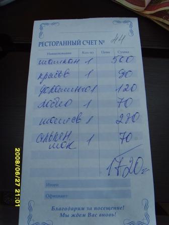 Как то, уже давно, приезжаю в Москву, пошли с братом в ресторан (в Измайловской гостинице). Принесли щёт на бумажке -- хотя и тогда было в основном уже автоматизировано.