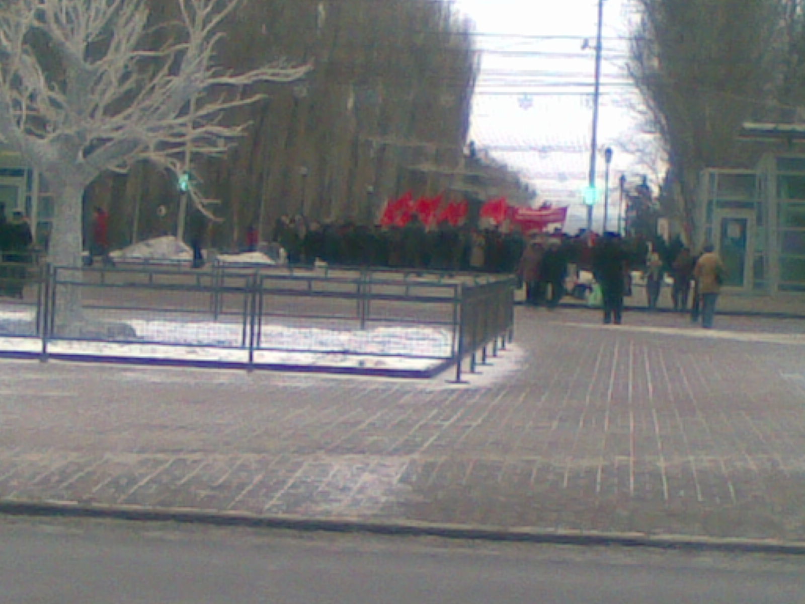 Прошел по центру - нету никакого ЕдРо-митинга. Есть митинг коммунистов у баобаба на Аллее Героев. Человек 300. Под лозунгом "отстоим социальные льготы". Растяжка наверно еще от зурабовских реформ осталась. 90% cтарички и старушки. Выступала бабушка-Апарина. Клялась что коммунисты ночами не спят - воюют за льготы для старичков. Старички вяло аплодировали. Потом выступала "внучка". Кляла антинародный режим. Открывала глаза старичкам на то что заводы и фабрики в разрухе. Как про Путина вспомнила - пять мирно зевающих милиционеров оцепления встрепенулись и грозно обошли митинг на предмет дебоширов. Но таковых не нашлось и собравшись в кучку они стали рассуждать сколько им еще тут мерзнуть. Старший сказал - еще минут 15. Я пошел по магазинам глянуть как там цены, а когда вышел - митинга уже не было.