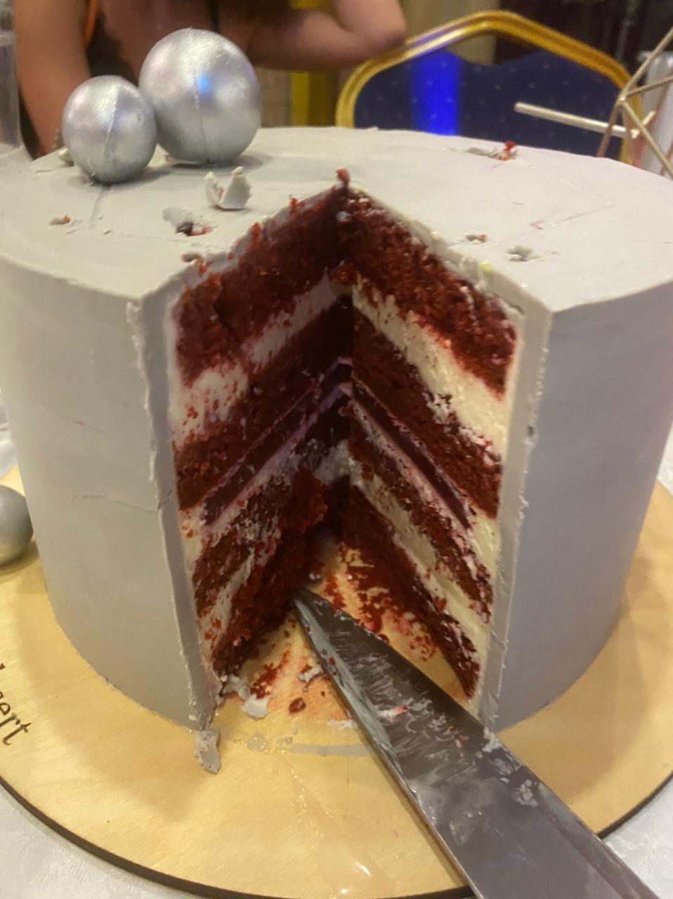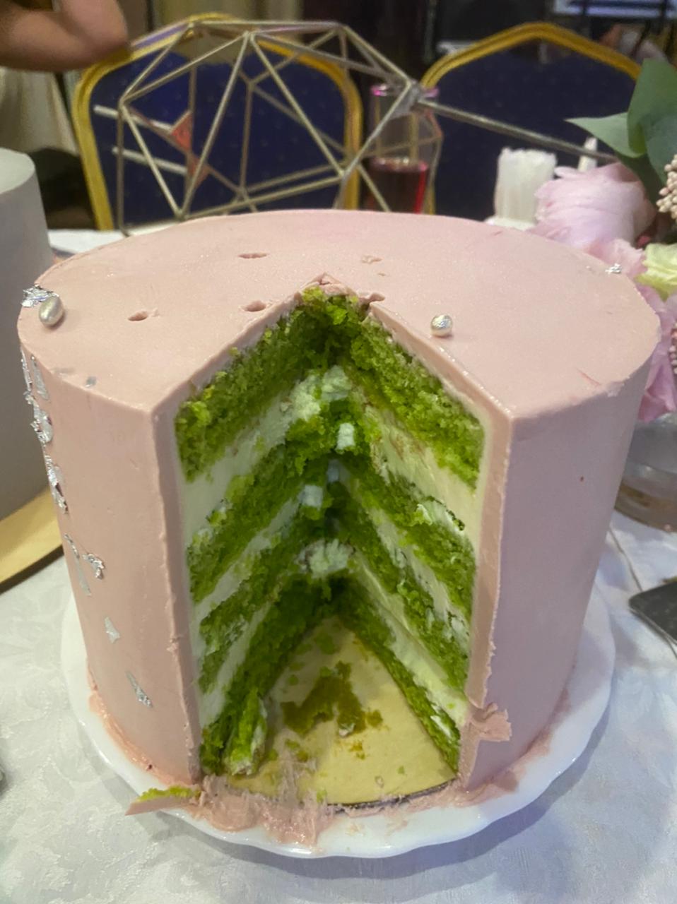 Торт. Торт был ********** вкусным! Рассчитан был на большую компанию, но сожрали мы его и маленьким составом сразу))) Красный бархат и шпинат-лайм. И ещё нам подарили вазу, которую я назвала своим новым бокалом для вина)
