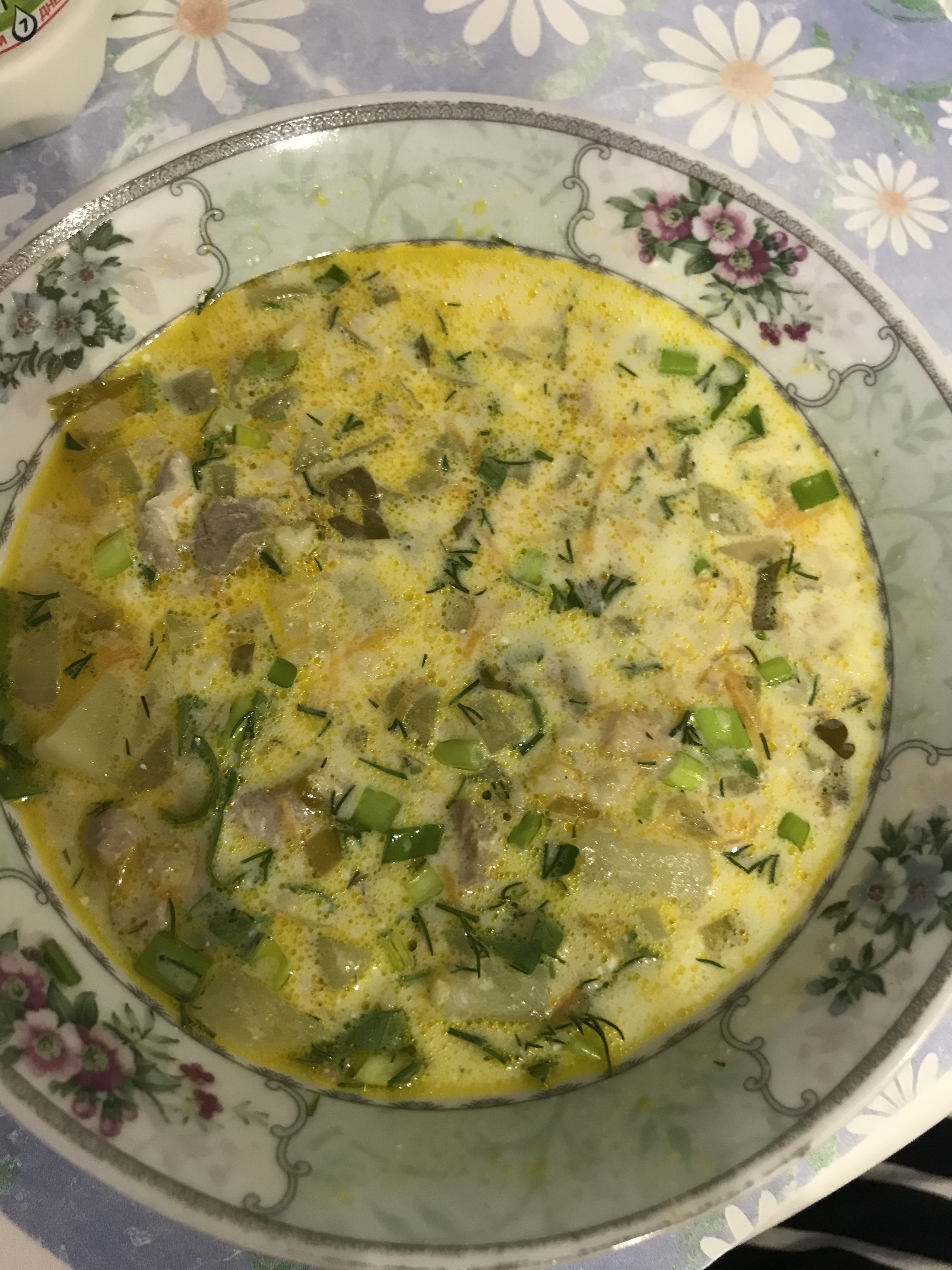Вчера в ночь поставил суп. 1Кг мяса, 3 луковицы, 50гр гречки, 80гр гороха. Ни че так. Но по мне мяса многовато, т.к. жирноват бульён