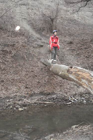 Когда, наконец, добрались до финиша, пошли смотреть, где же все-таки был в ноябре никем не найденный бонусный (а по факту антибонусный) КП. По легенде «гора на горе». А оказалось «под горой на горе». Angel, можем наконец спать спокойно :pok:: мы нигде не лопухнулись. Случайно можно было набрести на этот КП, но логически из легенды его местоположение не выводилось. Мы полезли по тропинке на «гору», а требовалось не доходя вершины холма свернуть в сторону, выходя на отвесный склон. В принципе случайно заметить могли, мы же смотрели вниз с холма, но то ли ночью было не видно, то ли бумажка куда-то делась еще до нашего прихода (все остальные КП сохранились по сей день, кроме этого). Ну да ладно.