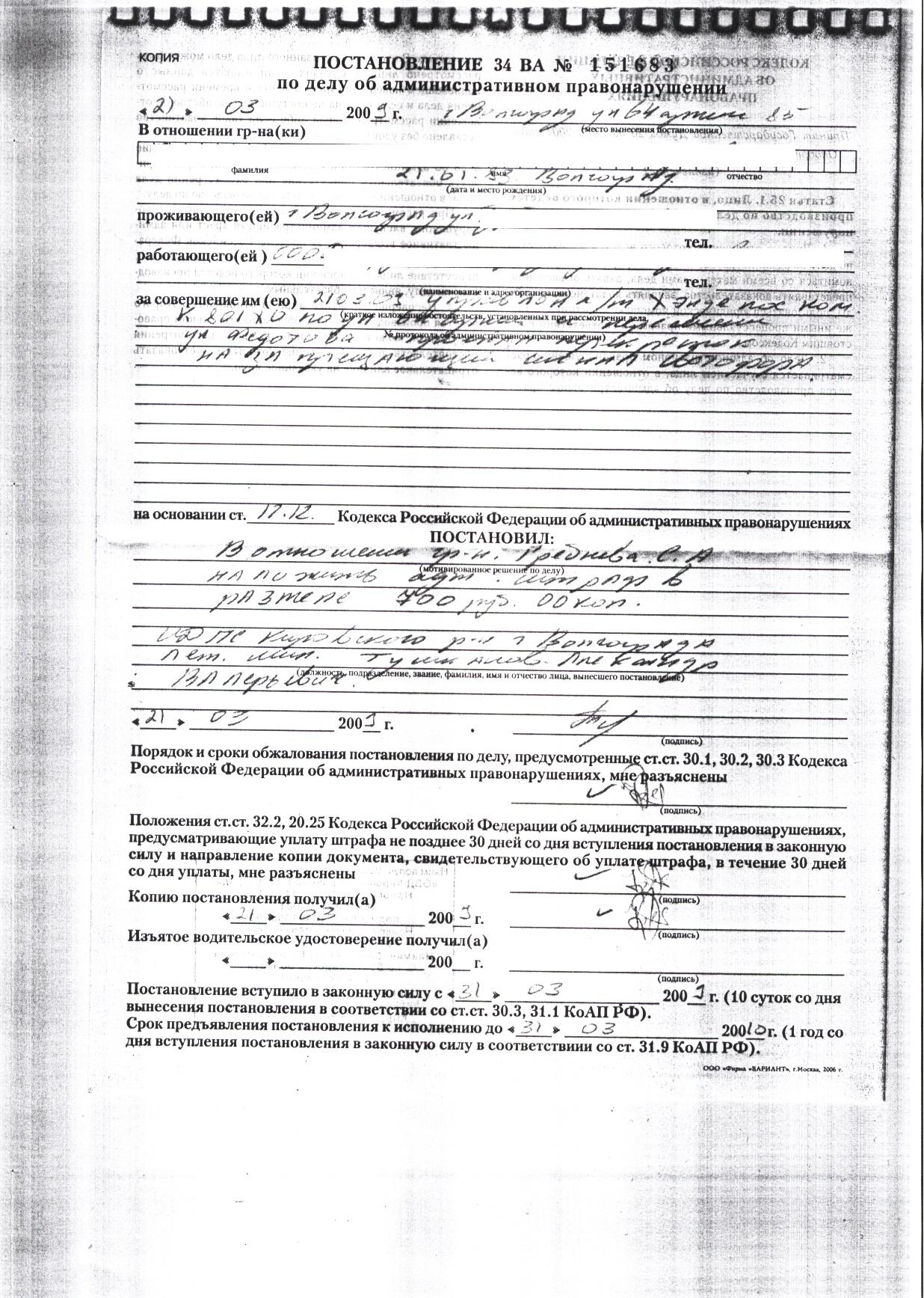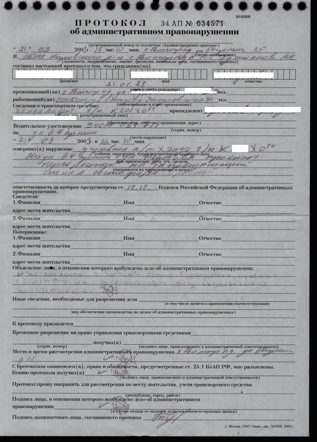 Если ваше замечание относится к этому по смыслу то ЛВОК в случае выненесения постановления обжалует его в 10-дневный срок с даты получения. Подозреваю, что minitorу так же потихарочке подсунули расписаться и в постановлении, как и моему товарищу в тонировке. И опять же Кировское ГАИ и адрес в 2 номера дома отличается всего, Место ловучее у Авангарда, методы и приемы ловли одинаковые и незаконные. И протокол и постанова одним лицом при несогласии ЛВОКа - это почти классикой становится. Всегда умиляет одинаковое время нарушения и время составления. Как они себе это представляют...да еще умудряются всунуть туда (хотя бы гипотетически) процесс псевдоознакомления с правами Ну и что ж не поделитесь с общественностью. Интересно по какой такой ст КоАП за 10.1 вас хотели поиметь?