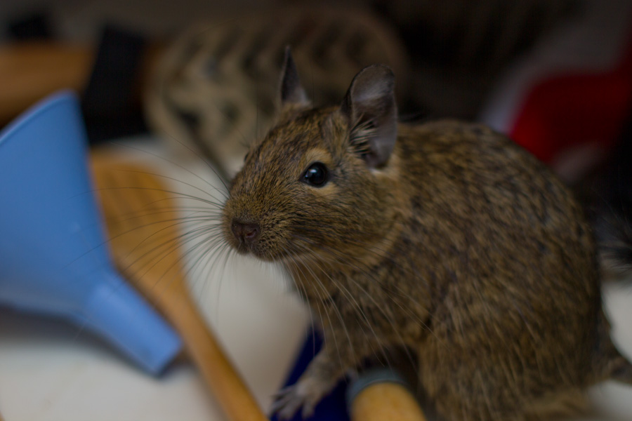 Девочка очень активная, на месте не сидит, за день обжилась со всем моим зоопарком.