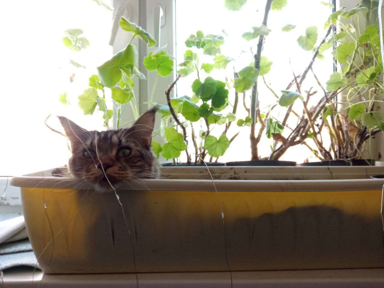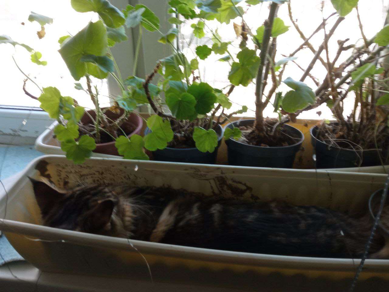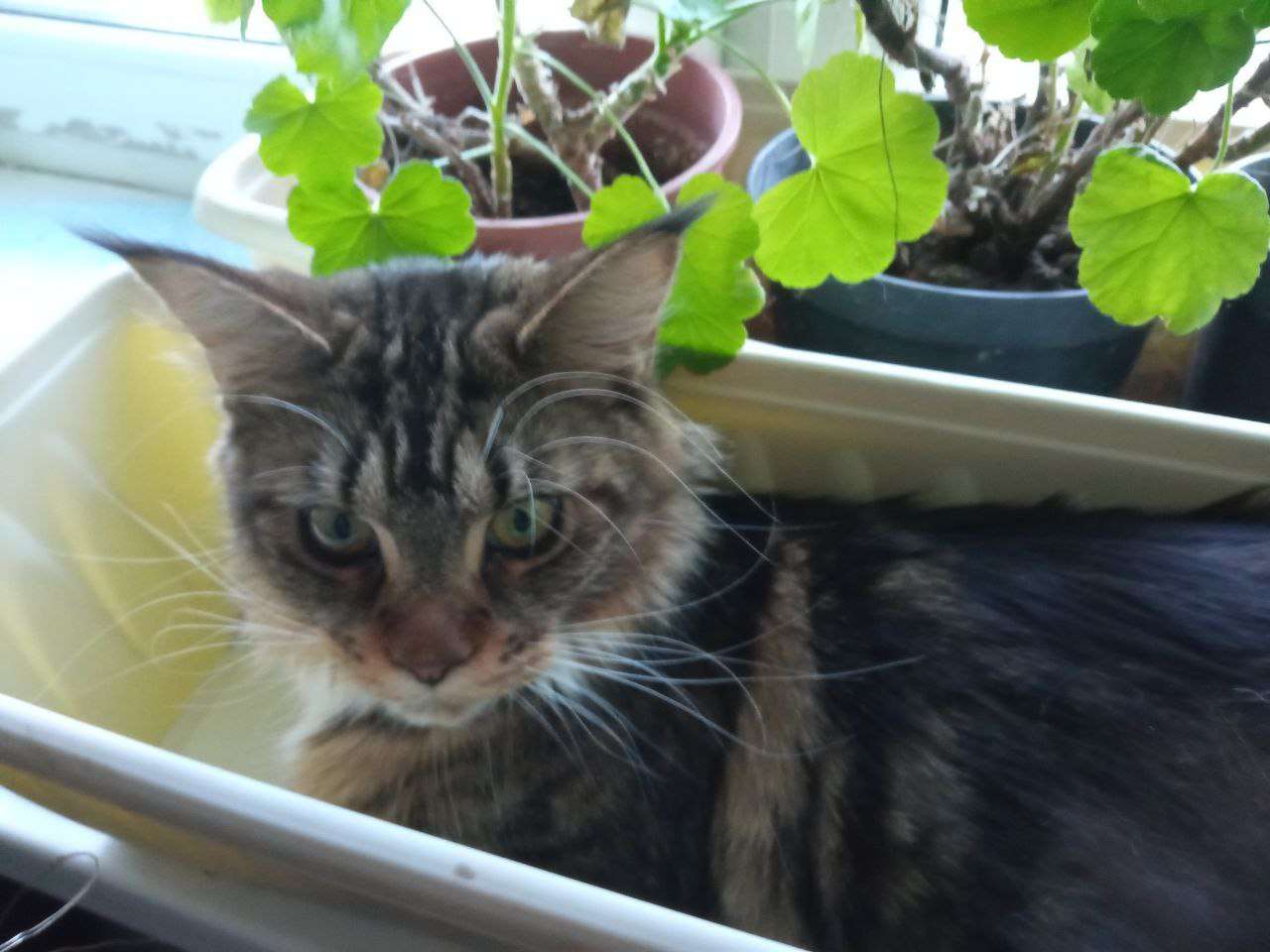 любит смотреть на крутящееся бельё в машинке и люто любит спать/прятаться в ящике для цветов.
