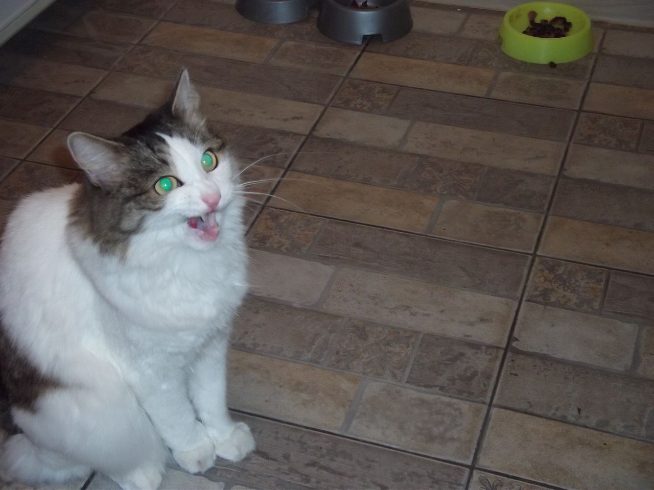 Эта скотина людскую пищу не признаöт... Вот и доволен: утром какой-ибудь мокрый 'мяскас' из пакетика, а вечером - куриные субпродукты. За компанию с хозяевами: жареные семечки, консервированные кукуруза и горошек, сухарики и чипсы)))