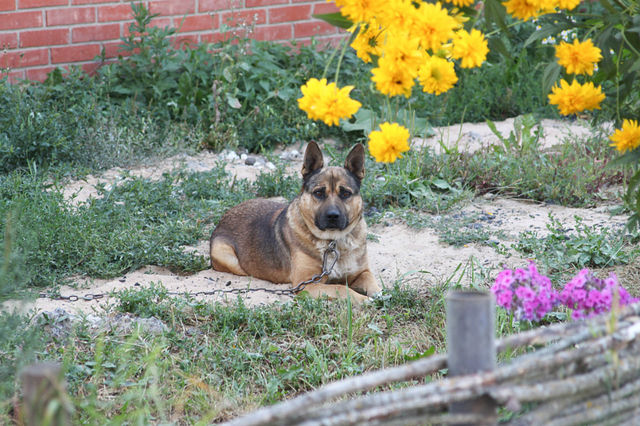 Свои машины узнает по звуку от поворота и становится в стойку, ждет.