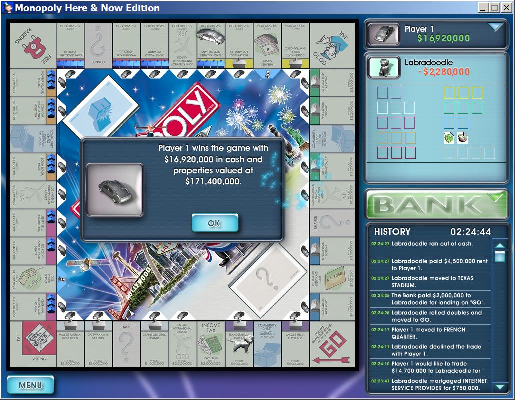 Короче, эта игра убивает у меня всё свободное время последние две недели ))) это самый лучший вариант Монополии на компе который я видел. кто любит эту игру - рекомендую, все русские поделки и рядом не стояли. она на английском, но не бойтесь там всё просто и понятно. если что - спрашивайте, я подскажу. весит мало, устновки не требует, идёт с флешки )) игруха реально клёвая ) прочитать тут скачать 14 Мб тут наслаждайтесь! )