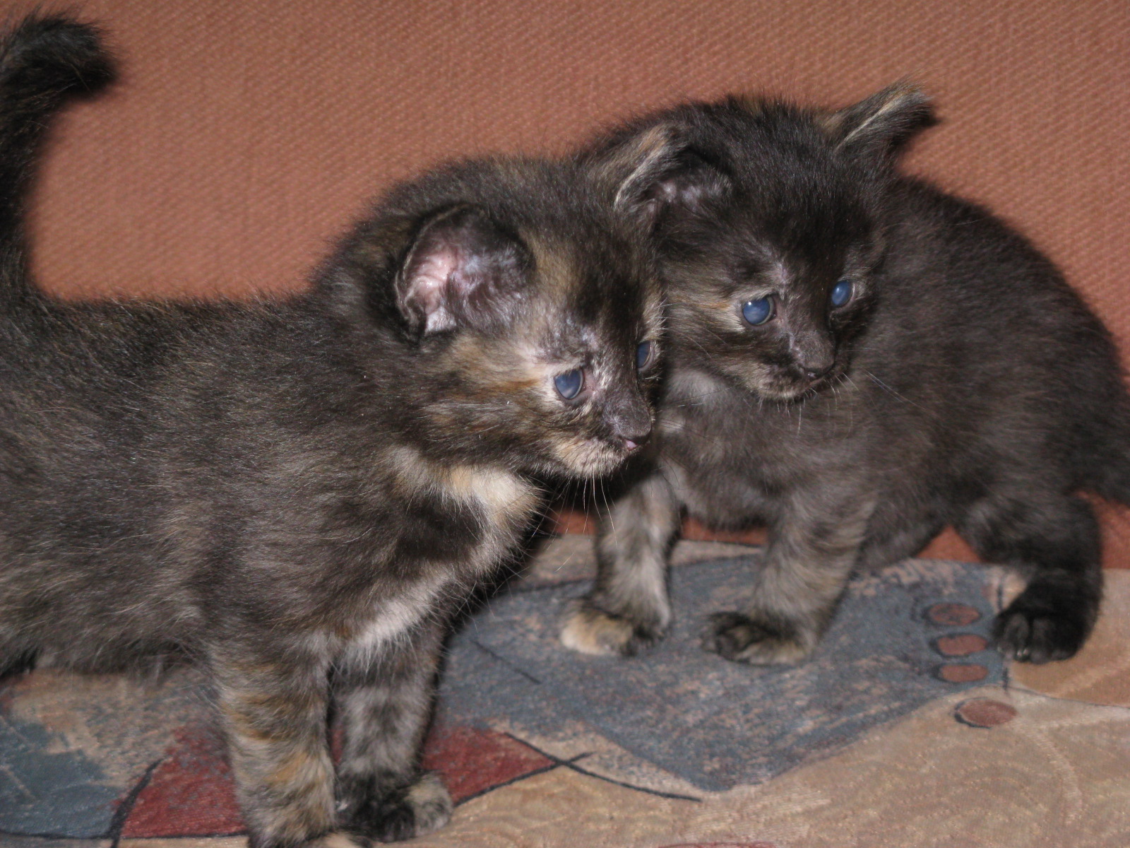 LAN54, нет, бурундучков уже нет. Зато остались не менее очаровательные и привлекательные кошечки редкого окраса (фото см. ниже) Они преимущественно дымчато-черные, с бежевой грудкой и рыжими искорками на мордочках и ушках. Глаза сейчас зеленые, а чуть позже будут красивого янтарного цвета (это совершенно точно - мы уже убедились на предыдущих котятах) По характеру очень общительные, веселые и игривые. Ласковые. Кушают самостоятельно. И они готовы принести счастье своим новым хозяевам! Причем - двойное! (Сами трехцветные и мама-кошка также трехцветная). Так что - забирайте!