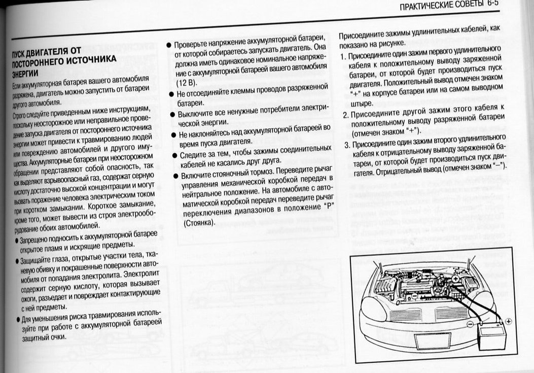 говорят: в Москве кур доят... никакого геморроя: если изначально исправен бензонасос, то залил - поехал знаю - было у мну так добавлено через 5 минут конечно, не будет!:electric: у Кроны внутреннее сопротивление большое, и при хорошей нагрузке напруга у неё сильно падает. но всё-равно не пойму: подгоняем машину-донора, глушим (как говорят Мастера), кидаем провода для "прикуривания", заводим свою, даём чуток поработать, отключаем провода, заводим донора, жмём друг другу руки и поехали, а снимать АКБ то зачем??? вот что мануал про пуск от постороннего источника пишет