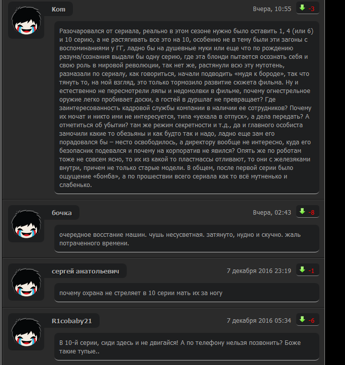И ещё, стоит только появиться критическому каменту, зомбо-поклонники сериала сразу начинают минусить. Вот почему так...