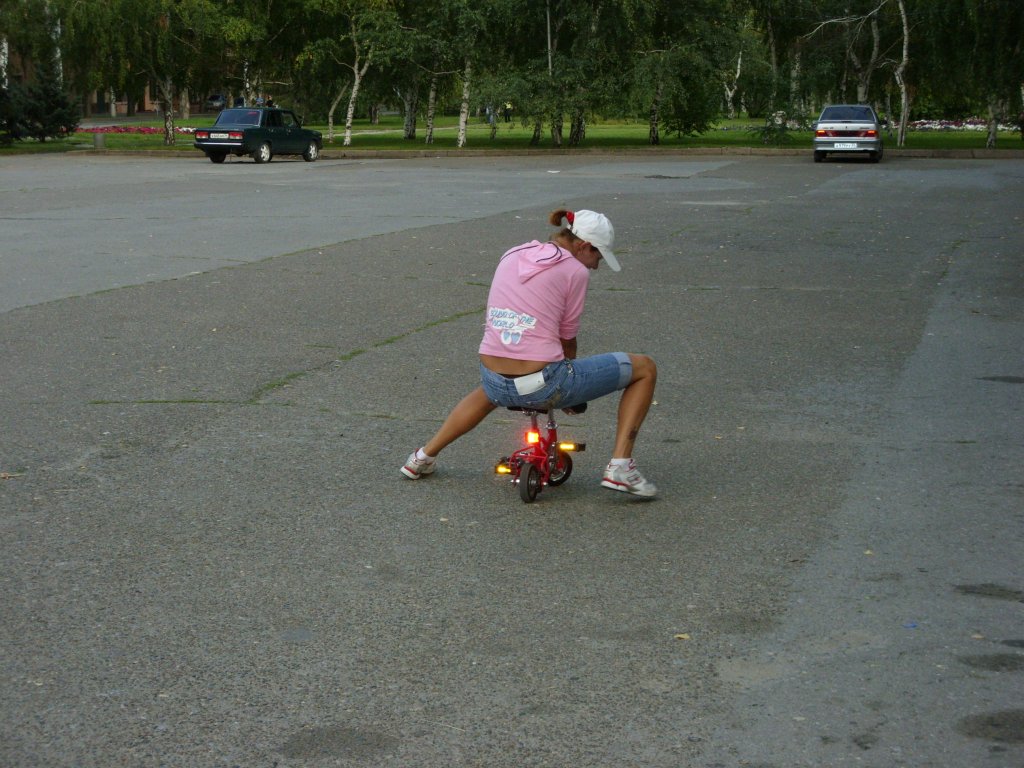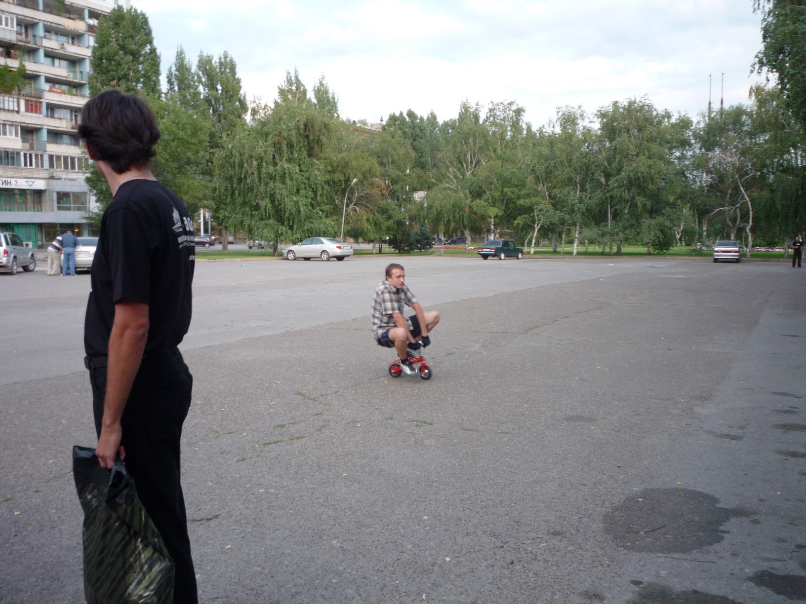Ну почему же?! Мы втроём с LightSide поехали (сильно сказано) к BMX-ам, показать творение немецких инженеров. BMX-ры оказались не очень любопытными, несмотря на то, что микровелосипед кружил у них под ногами. Но вот роллеры это что-то: облепили его со всех сторон и фоткали его прям на ходу. Одна девушка даже пыталась схватить LightSide за спину, видать, чтобы проехаться. В итоге измученный водитель мини-байка устал и пытался за меня зацепиться, чтобы я его немного повозил и всю дорогу просился на кресло на велик моей девушки. Прохожие, при виде этой чудо-техники, не скрывали улыбок и фоткали его кто на телефон, а кто на фотик. Вобщем полный аншлаг Попробуем проехаться?! Сам мини-байк: Часть собравшихся:
