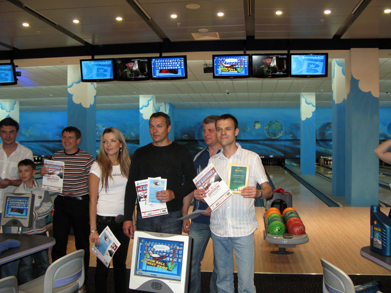 Да, с нашей команды (дорожки) только Демиург не пробрался в 16 лучших, из 96 человек! Вышли: Иван, Амина, Сергей, Я, Лорик. Своего первого соперника я одолел с, не помню каким счетом, но с хорошим перевесом Амина разнесла Ваню И мы очутились в 8-ке лучших, где нам выпало играть с Аминой, в игре я победил 140 / 95, и прошел в 4-ку. В четверке мне опять досталась девушка, но которая показывала по всей игре очень хорошие результаты, и была опасным соперником, в итоге я у нее выиграл со счетом 161 / 157 , шли ноздря в ноздрю... Но-но-но ее гандикап, как женщине, 15 очков сделал свое коварное дело, и она прошла далее биться за 1 или 2 место, а я проиграл в игре за 3 и 4 место. Усталость и 6 часов на ногах давало знать все сильнее. Тем самым занято 4-е место. Играли на Брансвике, на котором всегда проблемы с шарами, а именно соответствие веса и дырок под пальцы. Поэтому было достаточно тяжело, ведь мы всегда играли на АМФ. Перед этим турниром не было никаких тренировок. Все мы играли последний раз, что нельзя уже его вспомнить, когда это было... Без призов не осталась десятка первых мест. Особо ценные призы получили первые три места.