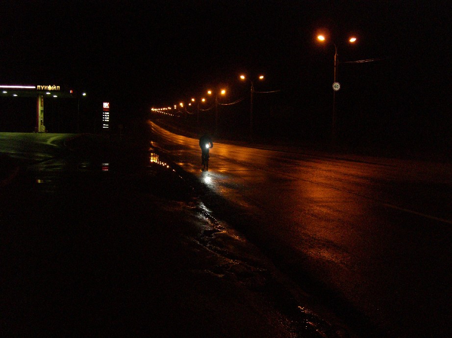 300 не 200. Немножко больше. Маршрут - Волгоград - Калач-на-Дону-Волгоград-Гумрак-Качалино(ж/д переезд)-Степной-Гумрак-Волгоград. Общим местом становится - велосипед готовится к старту накануне... Более-менее подготовив вел в 23:30 перед стартом отрубаюсь до 6:00 утра. Просыпаюсь не от будильника - огромные капли грохочут о карниз окна. Грамотно я прикупил ПИК99овский дождевик-накидку накануне, и забегая вперед, скажу: не пожалел ни разу. Подъезжаю к старту - стартующий народ в основном на шоссерах, байков на сей раз абсолютное меньшинство. Глядя на узенькую беговую резину (и на байках тоже!!!) чувствую себя на своих (Kenda 2,25 Small block eight) джипом с соревнований Париж-Дакар непонятно как и зачем поставленным на старт вместе с болидами Ф1. Ну и ладно. Не беру с собой воду. Да и зачем? Лишний груз. Мне в такую погодку до Калача пить точно не нужно, учитывая, что гнать я не собираюсь, проверено. Посматриваю на часы, на пройденый пробег и прикидываю в уме среднюю. Решаю - до почты в Калаче останавливаться не буду. Кручу ровно 22-23 км/ч. Стараюсь не раскручиваться не ускоряться, но и не "проваливать" темп. Проколы у шоссеров постоянно, вот прокололся и стоит, занимаясь своим велом Кирилл, вот прокололся Денис. Время идет, километры прибавляются бодрячком, всю дистанцию бы так. Проезжаю развилку Ростов - Элиста. Хм, а почему меня никто не обгоняет-то? Заезжаю на мост. Наконец Денис обгоняет меня сразу после моста. Въезжаю в Калач на почту, отмечаюсь. Слегка перекусываю возле какого-то магазинчика. А пить по прежнему не хочу, но правило есть правило - нужно попить до того, как пить захотелось. Пусть будет вишневый сок, он вкусный, с углеводами и, если повезет, из вишни. На обратном пути возле Нового Рогачика прокалываюсь, несмотря на чудо-резину "ловлю" новенький саморез от грязезащиты какой-то тачки в переднее колесо, теряю темп, что поделать? Хорошо, дождь вдруг прекратился - как будто кран в душевой перекрыли. Останавливается рядом Кирилл (на машине) оказывается, он сошел с дистанции из за проколов и курсирует теперь вдоль трассы, на случай, если марафонцам понадобится помощь. Проехал Новый Рогачик - и перед Максимкой прямо сверху на меня сияет солнце. Поднимает настроение, а вот ноги уже "подсели" и не желают подниматься на Максимку в хорошем темпе. Может быть закончить первый круг и домой? Тем более, что практически все кто стартовал сошли... Но ведь еще утром я знал - я не сойду. Снова начнется дождь, я поеду дальше, все кончится глубокой ночью, будет жутковато ехать от Качалино, по абсолютно темной дороге, будут ныть связки на следующий день. Все так и было. 200 км я проехал за 10:40, это на час лучше, чем марафон-200, но там в кафешке я расслаблялся принципиально. Помню как тетенька на ж/д переезде в Качалино спрашивала меня "А вам за этот спорт хоть платят?" Непередаваемо сильно хотелось спать перед Степным, километров за 15. После Степного отпустило. Дорожка к Новой Надежде спать не давала, мягко скажем. Резко поднялось настроение от совершенно городского освещения Гумрака. В 2:49 одометр компьютера показал 300 км, я на старте сбрасывал (значит, я ЭТО сделал). Но мне ведь еще ехать домой к Комочкову, для таких, припозднившихся финиш домашний. Показалось - нереально долго подымался на 39 Гвардейскую нереально долго искал улицу Зорге (я буду доооооолго гнать велосипед )....... Вот мой мокрый бревет. (