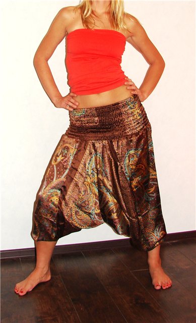 sovetnik, э, нет, тогда постой. Ты не видел мое фото в настоящих турецких "байан шальвар", женских шальварах. Уверяю, весьма сексуальные штаны и крой вовсе не тот, что у обычных, хотя на меня как раз и на тетю 54 размера одновременно. Такой вот парадокс. Но я их подарила даме, которая танцует восточные танцы. Теперь в поездку на отдых поеду и куплю еще. Чистый хлопок и свободное облегание - это что-то. Сексуально - ибо султаны не идиоты, к шальварам положено надевать камизу (рубашку длинную) только крестьянкам было, а вообще - короткий топик. Я надевала майку. Отличные штаны...