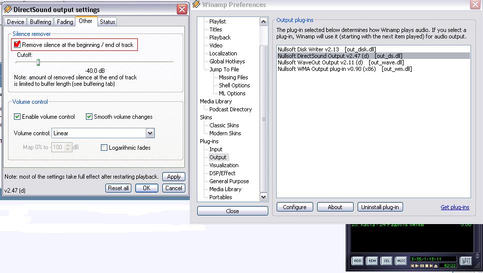 И снова вопрос. Каким проигрывателем можно обрезать автоматически несколько секнуд последних в песне. Вот например: идет песня, но последнии 5 - 8 сек. у нее в треке пусты т.е. беззвучны и должна пойти следующая, но приходится слушать 5 сек. тишину почти в каждой песне , так вот вопрос, какой проигрыватель обрезает эти 5 сек в сл. песне и микширирует стык песен в плейлисте. Можно ли сделать это в винампе? Спасибо за ответ!!!